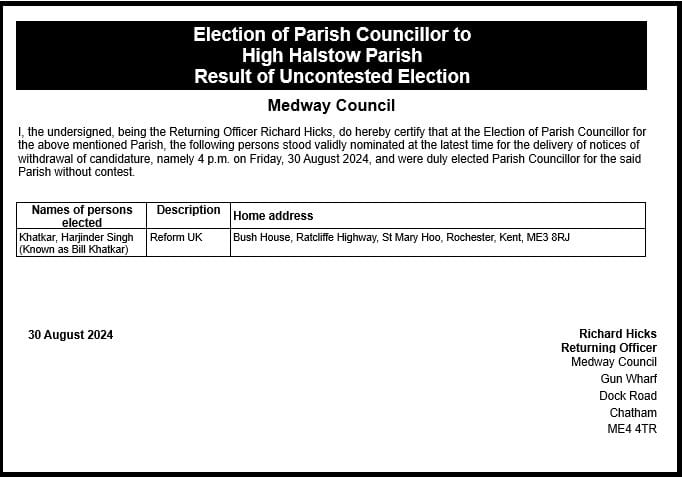Khatkar has an interesting history. We ran as one of the few Reform candidates in last year’s local elections, receiving 49 votes and a fifth-place finish in All Saints ward. Ahead of the General Election, he was the owner of the shop in Strood High Street that was covered in Reform advertising. The shop was found to be used as a drugs factory and raided by the police, while Khatkar protested to the press that he had no idea what was going on inside.