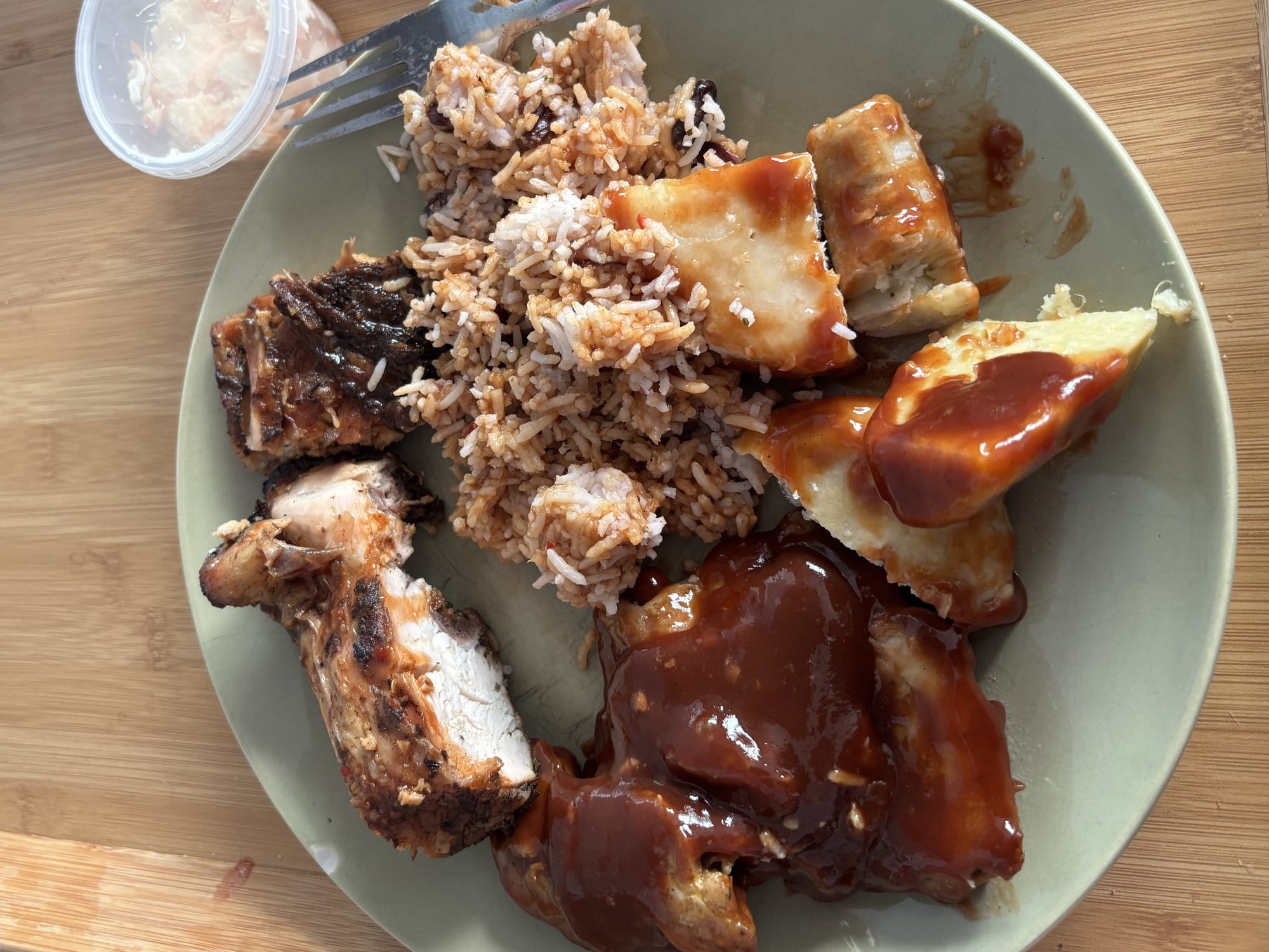 I ordered Jollof rice, coleslaw, barbeque chicken, and jerk chicken. The menu also featured something labelled ‘hard food,’ with no clarity on what that might be, so I ordered it to find out. Soon after the order was put through, we were informed that they were out of Jollof rice, so I ended up with plain rice instead.
