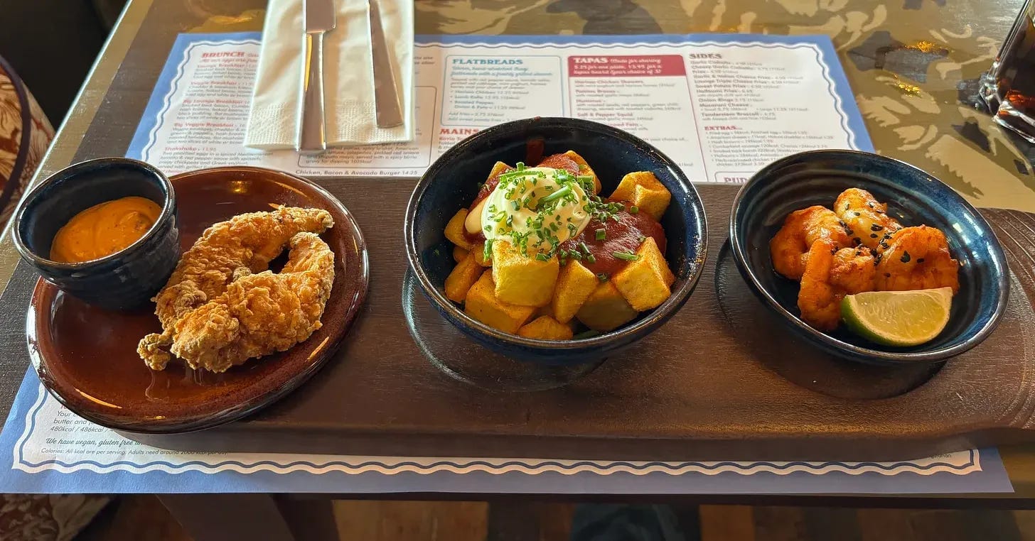 There is an app-based ordering system as well as bar service, though thankfully, as you are lounging, they serve to the table. As has been well established by now, I can’t ignore a small plate offering, even if they call it tapas and charge extra. I ordered patatas bravas with roasted garlic mayo, Louisiana fried chicken tenders with chipotle mayo, and Korean king prawns.