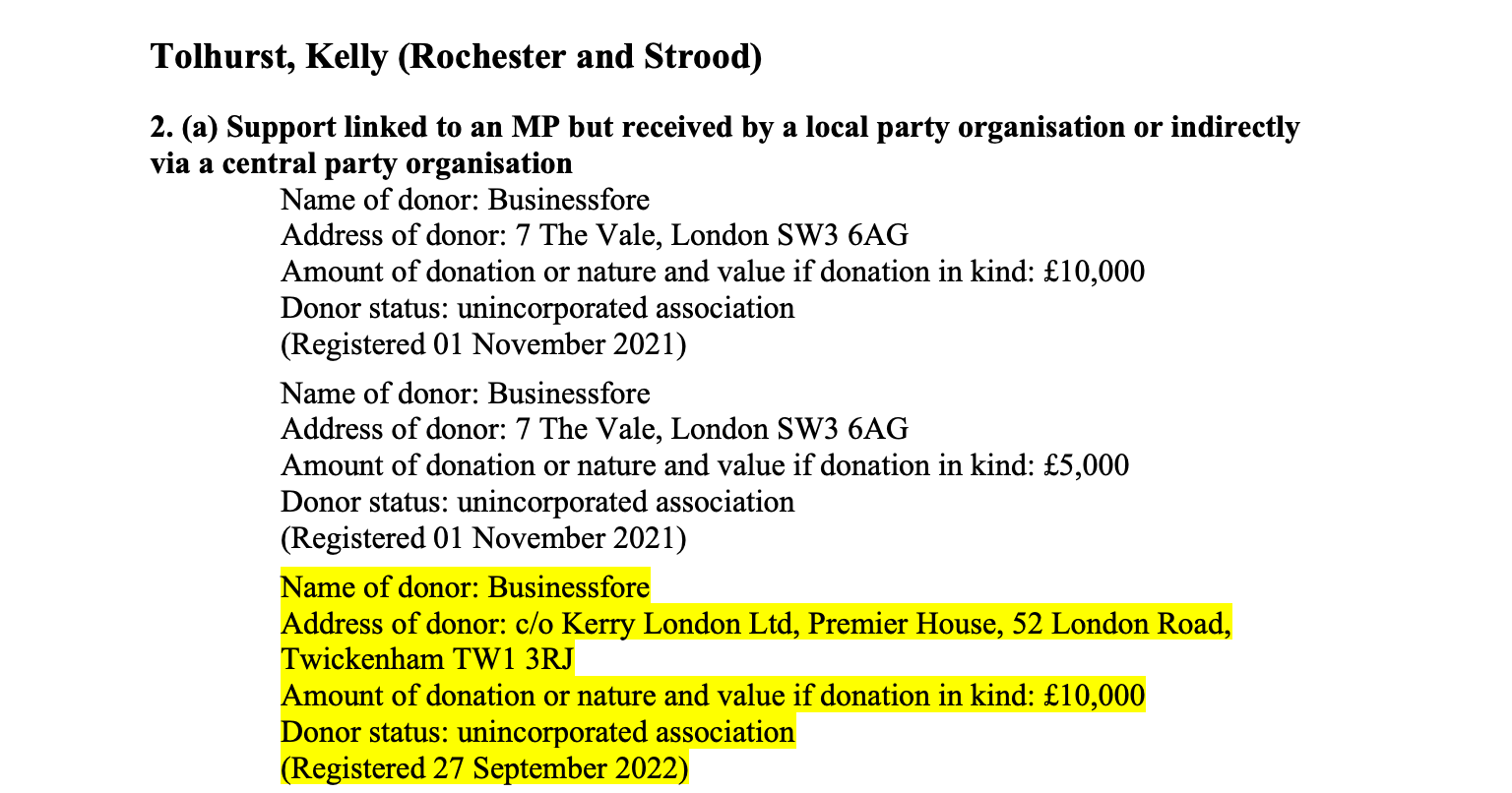 Big news for news of slightly shady donations to politicians, as Rochester and Strood MP Kelly Tolhurst has received another £10,000 donation from Businessfore, an organisation that doesn’t appear to actually exist.