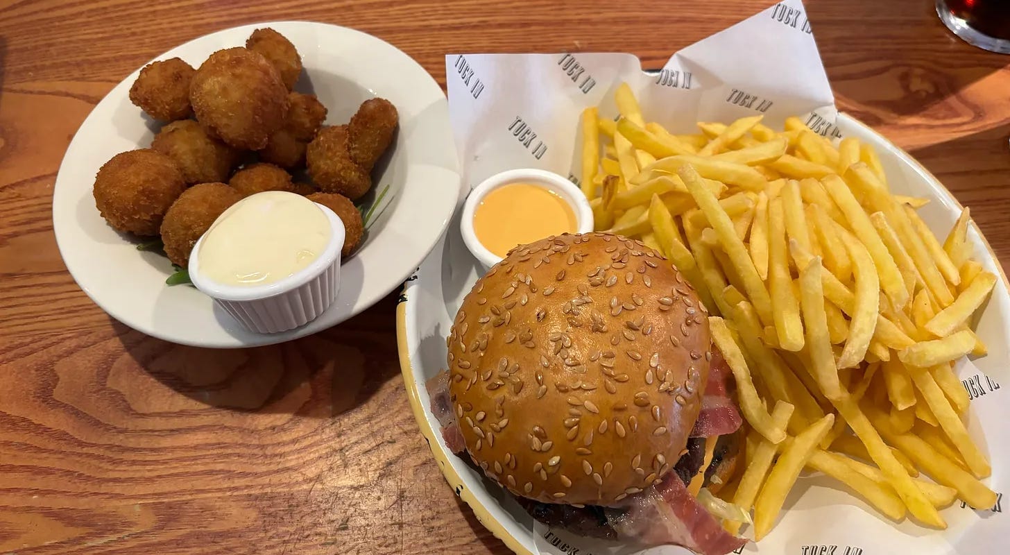 Lunch was a starter of breaded mushrooms, with a ‘cowboy’ burger and fries. The breaded mushrooms were well cooked and flavoursome for beige fried food, served with a garlic dip and, in this case, missing the chopped chives, not that it was a great loss. The starter became a side, however, as it was served with the burger, which consisted of two prime beef burgers topped with crispy bacon, American cheese and shredded iceberg lettuce. This was all well cooked and put together, served with warm, crispy fries and a small pot of burger sauce.