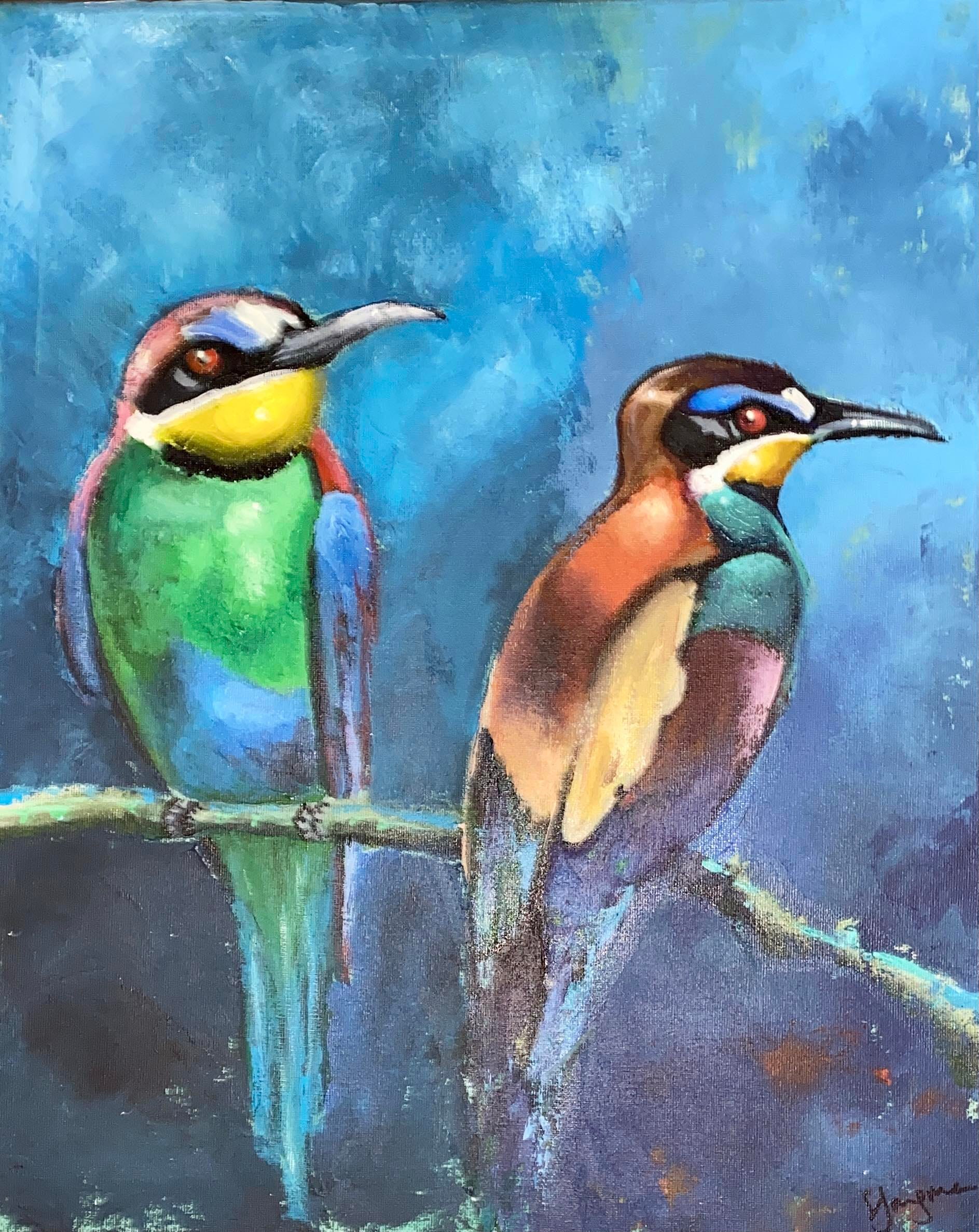 Their aim with art in troubled times seems to be to show how art saves us. Sophie does do more socially pointed work, but she also does birds. “There’s always pressure on me to do more birds.” The pieces complement each other, with Sophie intending to intersperse her bird paintings amongst Peter’s landscapes and then, if possible, have a Bluetooth speaker play birdsong to give the exhibition a positive feel.