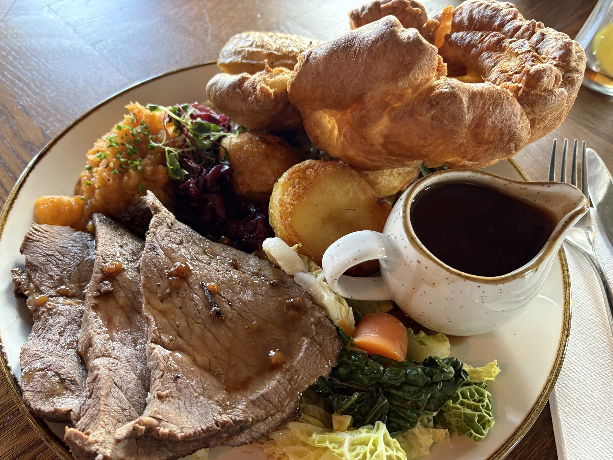 I ordered roast beef, with a selection of vegetables, roast potatoes, mashed swede, Yorkshire pudding and gravy. With the increasing costs in hospitality, the food is both similarily high and reasonably priced. Make of that what you will.