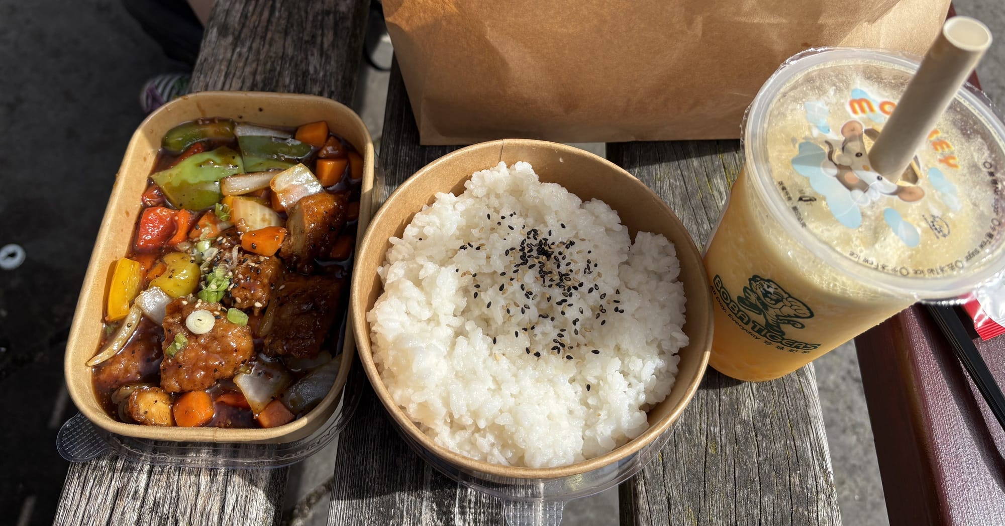 The crispy chicken in black pepper sauce was frankly delicious. The sushi rice, aka sticky rice, was fine, soaked up the black pepper sauce well, and became a solid accompaniment. The bao buns became a mess, with the salad under the chicken, meaning after you had eaten the chicken, you had a sticky-sweet salad bun. Nice if you like that sort of thing. The bubble tea I ordered at ’50 sugar.’ I didn’t really know what that meant. It means it was sweet. I almost fell into a diabetic coma just thinking what 100 sugar would be like.