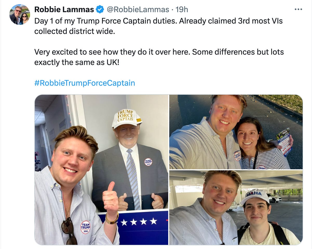 Given the Trump campaign has been outraged at the idea that Labour activists have been flying in to support Kamala Harris, presumably they will be unhappy that Cllr Lammas has turned up to offer their man support.
