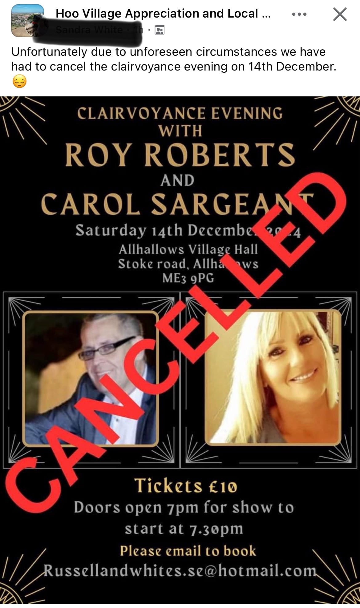 🔮 Finally, the clairvoyance evening at Allhallows Village Hall has been cancelled due to ‘unforeseen circumstances’: