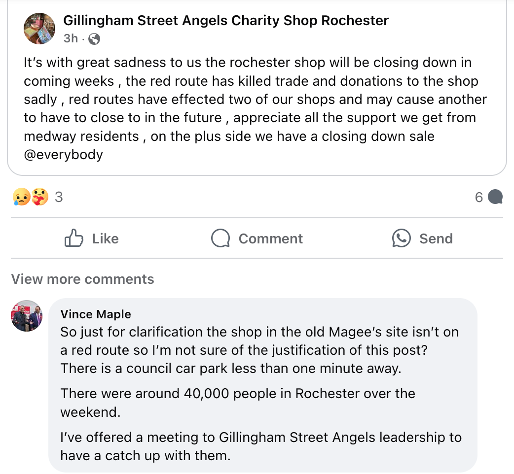 In this instance, they blamed the council’s red route scheme for ‘killing trade and donations to the shop’, suggesting another shop (presumably Rainham) is also at risk. This complaint seems somewhat more curious, given the Rochester shop isn’t on a red route and has a car park next door. It also raises questions about the business model of a shop that requires illegal parking to operate, but that’s another matter.