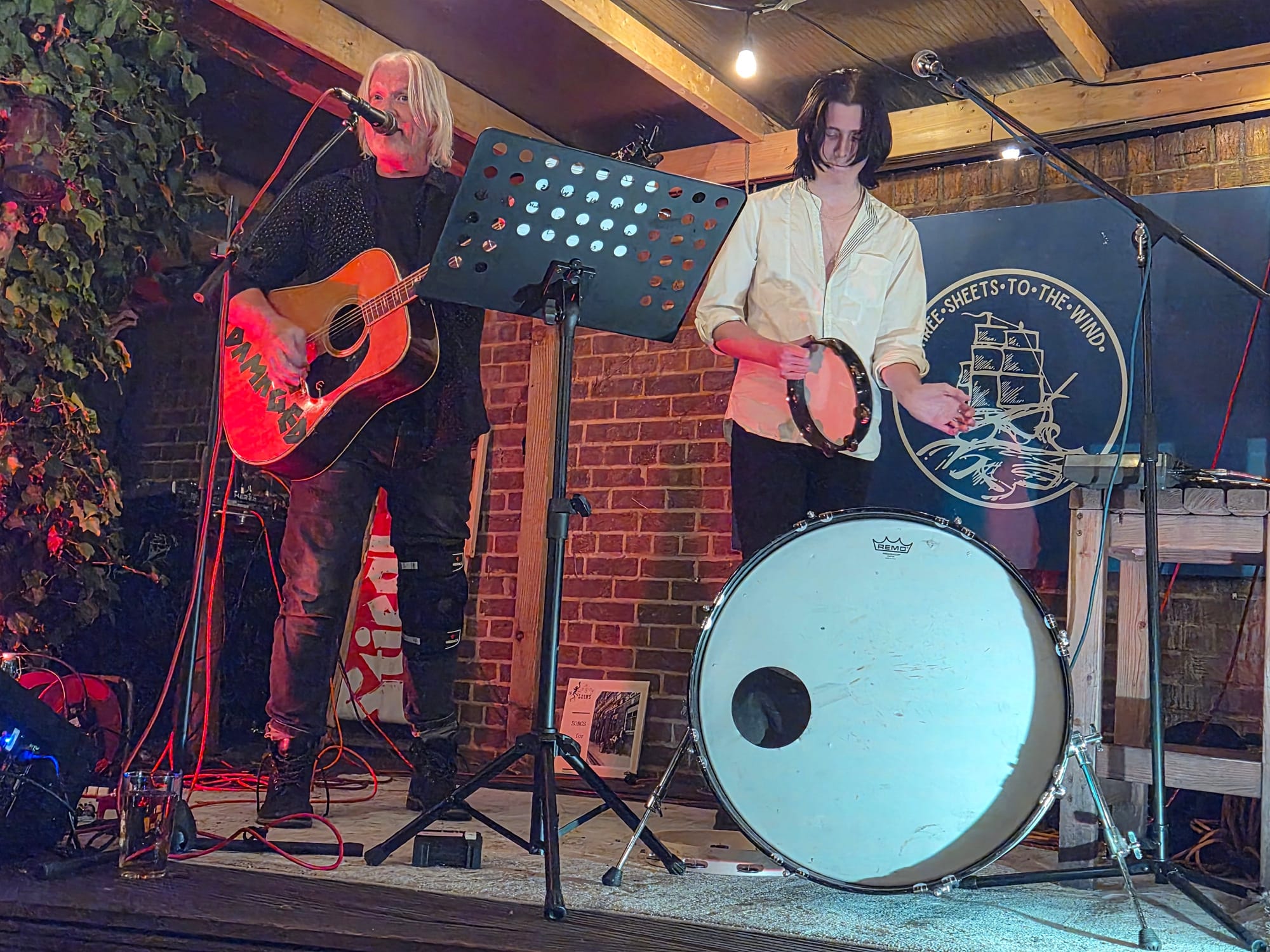 Oliver hands his father back his appropriately labelled, increasingly damaged 12-string and moves to stage right, for bass drum, tambourine, harmonica and occasional keyboard. An introduction of purpose is made, and songs commence. These songs are selected mostly from the first Singing Loins album, but the set avoids the songs they do as the expanded band. Fan favourites such as ‘Rochester My Dear’ and ‘Little Devil Doubt’ are present and correct, and an a cappella Allen and Son rendition of the Kipling nautical ‘The Storm Cone’ was ripped into, with the lyrics being shared off a phone screen around a shared mic. ‘Poteen,’ sung by Allen solo in the old days, features Oli on guitar, and the pair miss a trick in not mentioning their ‘Drunk and Fed’ Loins-based homemade wine. One of my favourites, ‘Right Good and Proper,’ with its tongue-in-cheek lyrical references to Philip Larkin’s ‘This Be The Verse,’ gets a deserved airing, and the set closed with the encore they forgot to advertise, in the form of their Bowie-influenced rendition of ‘Port of Amsterdam’ by Jacques Brel.
