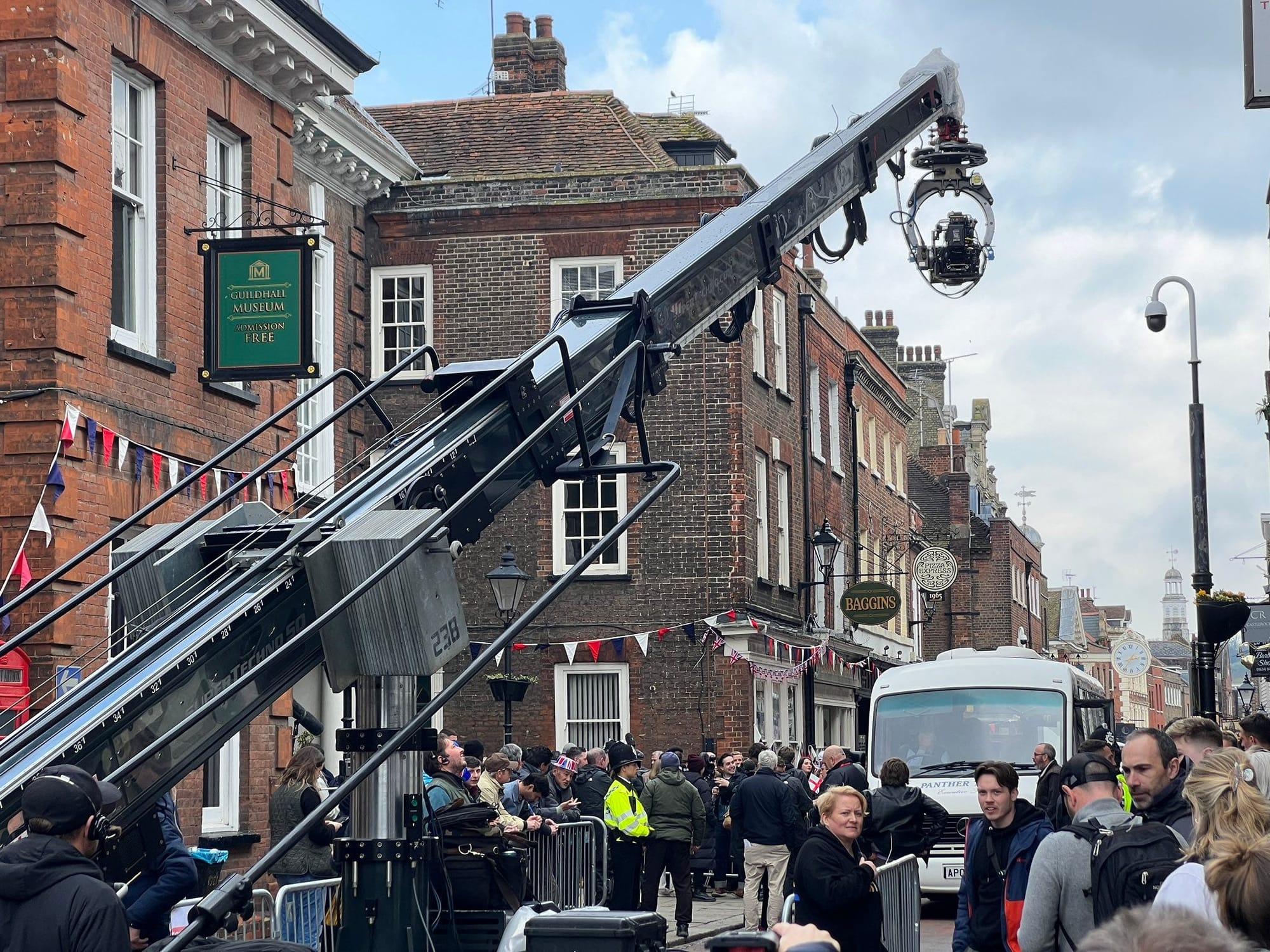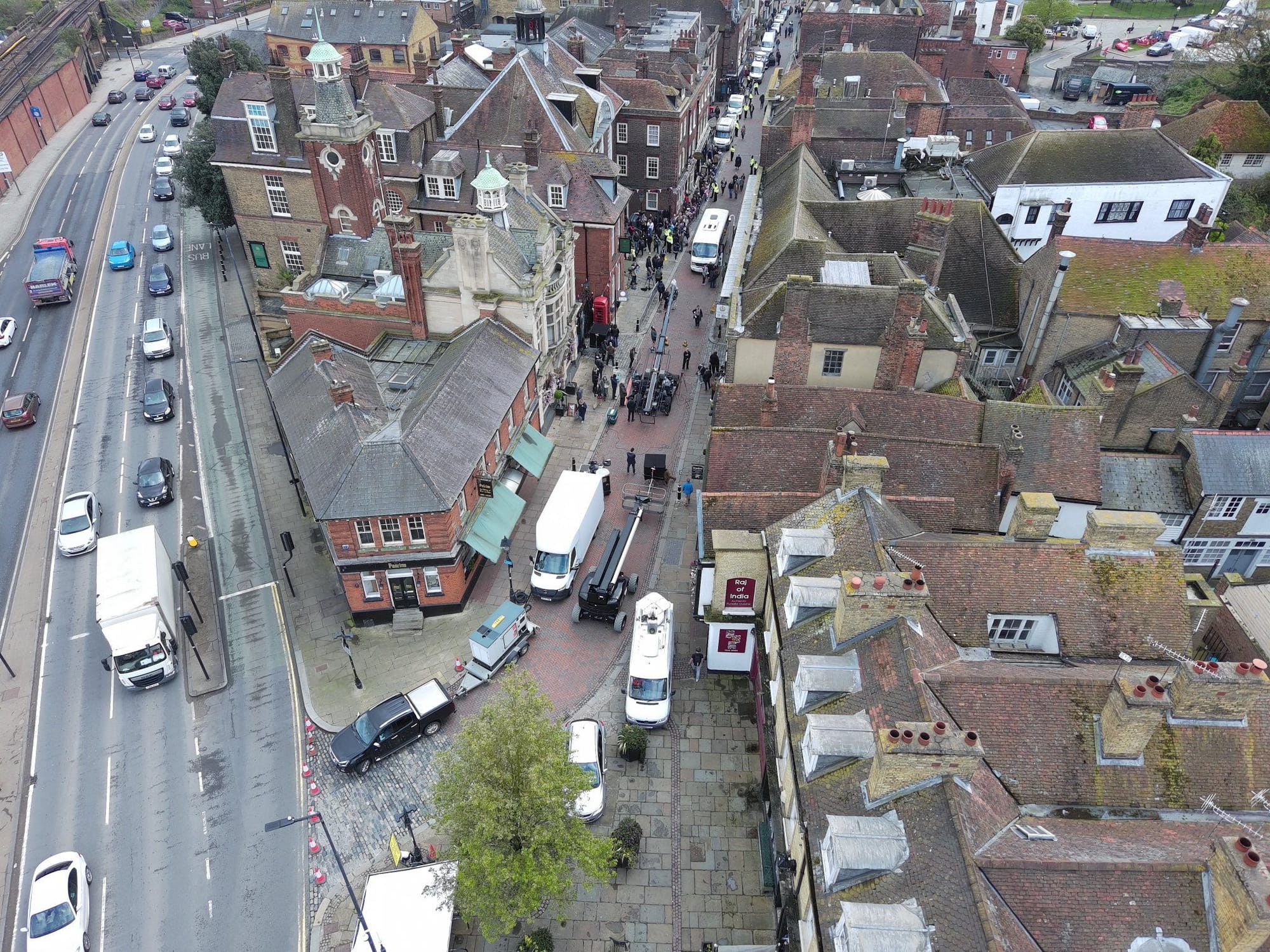 Local dronemaster Aerial Imaging South East was already in town, carrying out surveys on nearby roofs, and was able to get a sense of the scale of production on the High Street.