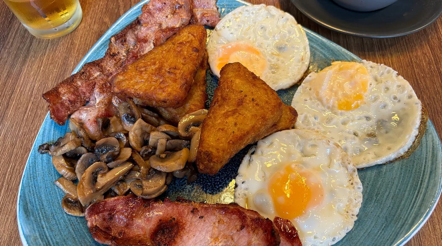 By a slight quirk, we arrived slightly early at 11.45, meaning we were given the breakfast menu, so this is an Out to Breakfast review. Even though the menu finished at 11.50, I ordered a ‘make your own’ breakfast with a double helping of hash browns, a portion of back bacon and (yes, and) streaky bacon, three fried eggs, and a portion of mushrooms. This was accompanied by Earl Grey tea and apple juice.