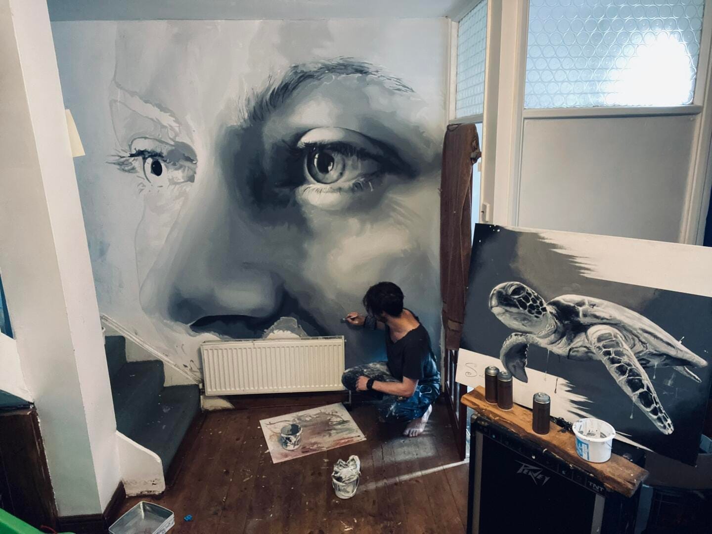 Sam acknowledges that sometimes there is work with no thought in it, which then encourages others to stick rubbish on the wall, but at the same time, “What I might see as rubbish is not necessarily what everyone else does.” Sam has a remarkable photo-realistic style for somebody who didn’t study art. Admitting that his style was originally “all over the place”, he trained himself with various YouTube videos and an apprenticeship with Marvellous Murals, where he learnt about the logistical side, like scaffolding and ladders. It was at this time that he realised that he preferred portraits to landscapes, and from there, he studied artists, even reaching out asking for tips and guidance and finding a generous community in return.