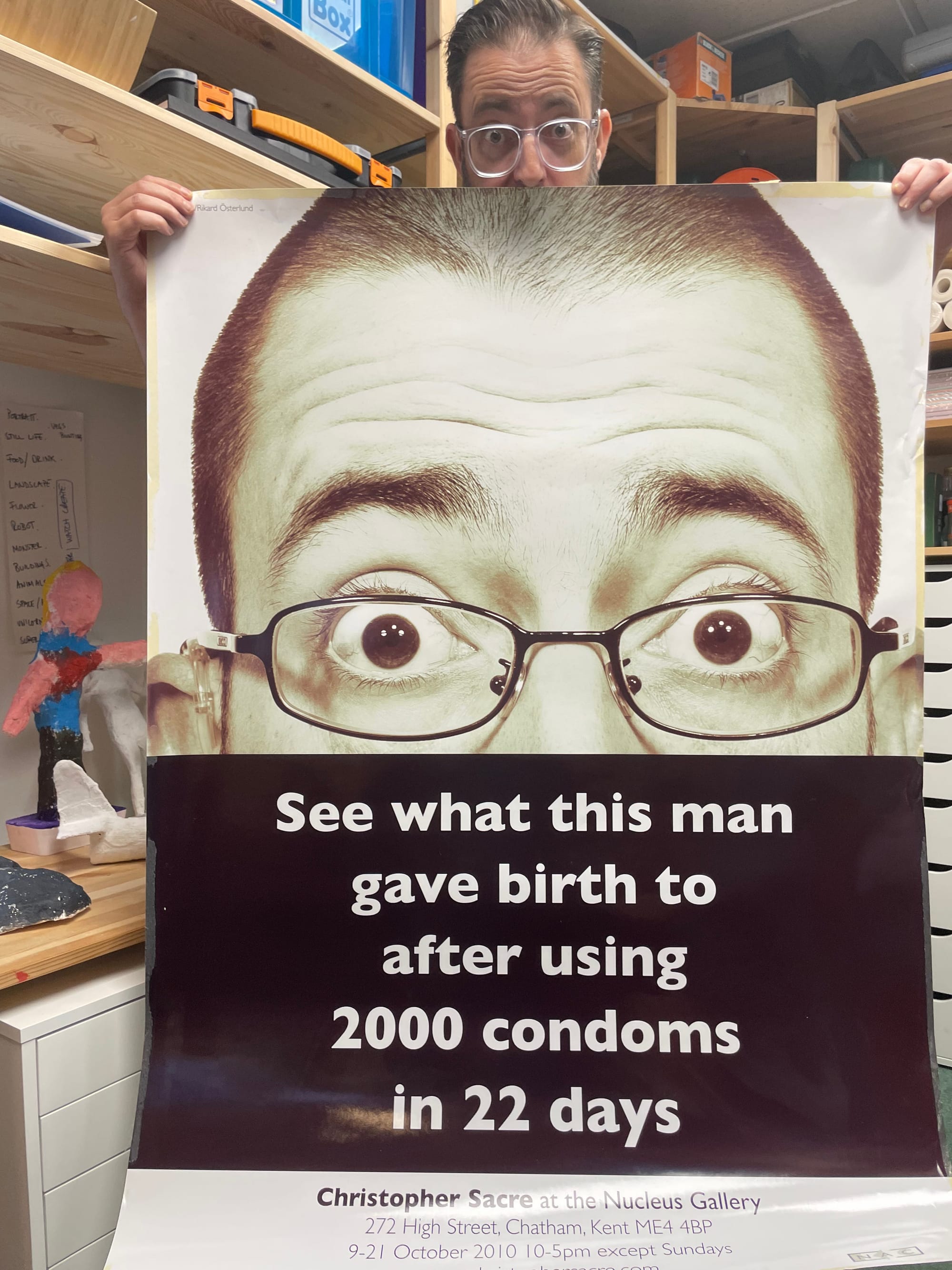 Over the years, I thought the shape reminded me of a person. I thought what if one of them became a life form? I poured plaster in, and it gave birth to a baby. What fascinated me was that I don’t know who this person is. Are they deaf, hearing, disabled? At the end of the day we are all human beings. I thought if I could make a thousand of them, I could tell a story about how deaf people communicate. Space is really important. In a circle, we can see each other, but not behind me. It was about the placement within the gallery space. I started making 1000 of them. Making and measuring and realising it wasn’t enough. The news started spreading, about me using condoms and stuff, and what was going on. Then my studio neighbour, Nick Evans, asked to design the poster and Rikard Osterlund took the photo. It was 1000 in 22 days, then a couple of weeks later I decided 2000, but I didn’t update the time. So, I needed to make 2000 in 22 days. This was paid for out of my own pocket with no funding. I put a teaser on social media and on opening night I had over 200 people who came, and I thought there’s something wrong here. So, I tried it in different places where people didn’t know me and still turnout was high.