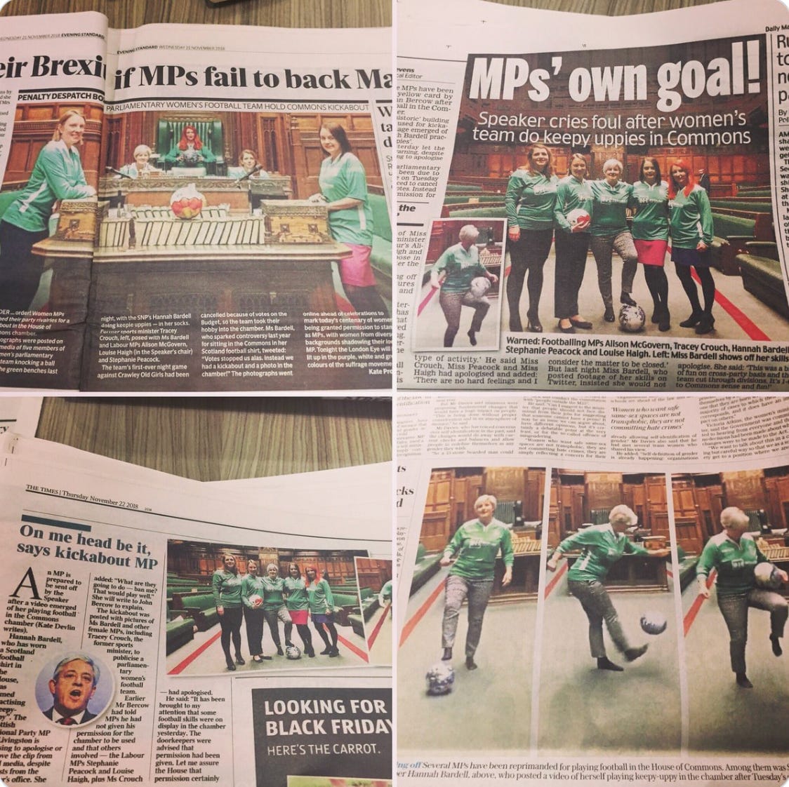 (laughs) It’s a bit of a myth really. We were having a photo of the women’s Parliamentary team and we obviously had a ball to pose with. Hannah Bardell, who is the SNP Member of Parliament, started doing keepie-uppies and it just went on, and we got severely told off. Quite severely told off. We weren’t having a full-blown match, it was just passing the ball in a very small place. Nevertheless, we shouldn’t have done so.