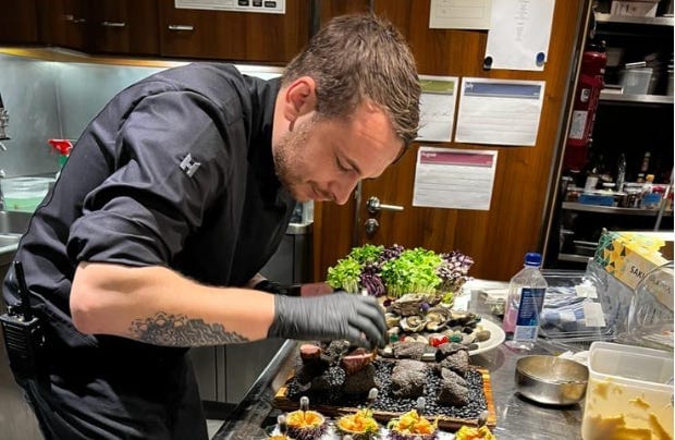 I tend to start work at 5:00 in the morning and do the breakfast. It'll be a selection of fresh breads, pastries, à la carte breakfast, so you are not limiting the guests’ options, from bacon and eggs to Italian truffle on toast. Some of the things can be quite extreme and some of the guests can be quite demanding. American guests will be happy if you put edible glitter into a hollandaise and think it's amazing. Whereas I can get a Russian client and they literally want the best of the best and they don't care how much it costs. I could pay for a small package to come from the best markets in in Paris. I could pay €20,000 and get a small box and get a little bit caviar and a little nugget of truffle, and the client is happy to pay that. When you're dealing with clientele the sky isn't even the limit, you have to be prepared to cook and cater for every single requirement. It is a different world. That's breakfast. You'll do a lunch, do hors d'oeuvres and canapes and then a four or five-course tasting menu in the evening. You can have the same guests for anywhere from a week to a month.