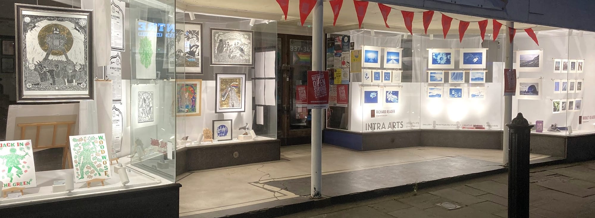 Intra Arts is a creative organisation that runs a makerspace that houses Medway Fine Printmakers, a studio with screen printing, etching press, all kinds of facilities for printmaking. It's also got a gallery space in the front windows. It used to be a department store and so it's got these big plate glass windows at the front, and we've converted it into a properly lit and easy to hang gallery space that changes as a programme, curated programme of exhibitions that changes every month. People that are walking past can see these exhibitions because a lot of them wouldn't think to walk into an art gallery, but they do interact with this. Intra Arts runs that space, there are three directors, and we go into schools, and we run projects with different groups and then we run activities and festivals and get involved in all kinds of projects with other organisations too.