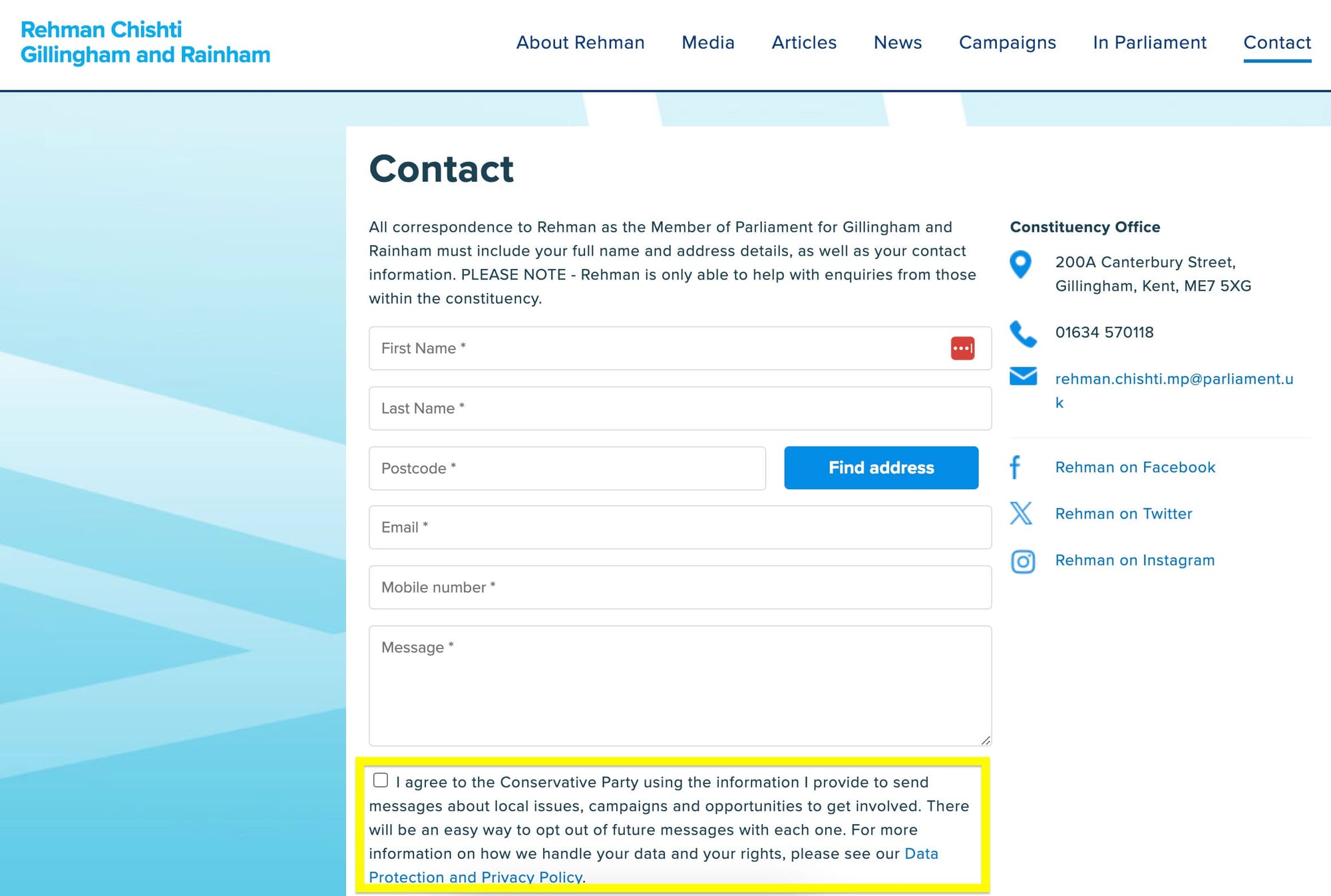 More questionable, however, is his website's contact page, which states that by contacting him, you can agree to ‘the Conservative Party using the information I provide to send messages about local issues, campaigns and opportunities to get involved’. While this tick box is optional, it is clear that Chishti is attempting to use his website to gather data for party political purposes.