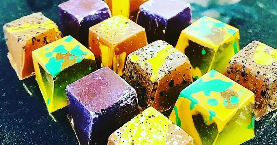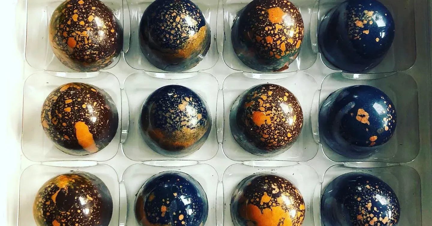 Beth works with couverture chocolate, which has about five ingredients in it. Most corner shop chocolate is a compound with about 20 ingredients in it. She uses Callebaut, made with cocoa butter, but also works with a dark chocolate variant when making pieces for vegans. “It's about creating crystals in the cooling down process so that the chocolate becomes shiny, has a nice snap and doesn't look dull and grey.” Beth makes all her chocolate individually by hand, and they are colourful. “That was intentional. I wanted to incorporate my art background. There is that hand-painted element.” The boxes are certainly fun to look at.