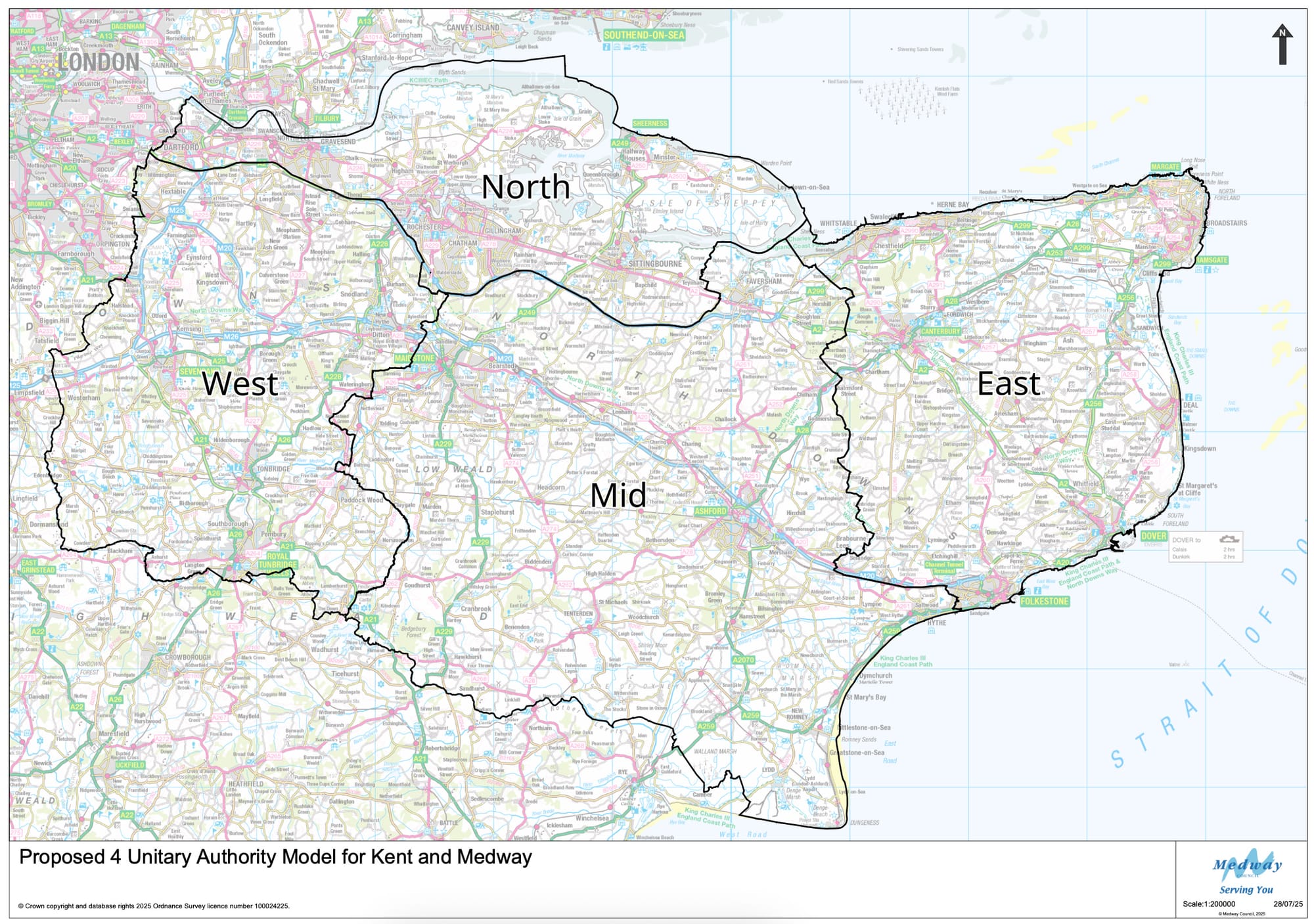 Medway Council’s Cabinet has voted to pay for a business case for its own version of local government reform, even though the plan has already been rejected by every other council in Kent. At last week’s Cabinet meeting, Labour administration councillors agreed to commission accountants KPMG to put together a business case for their own design for the future of Kent: a four-council map drawn up over the summer inside Gun Wharf.