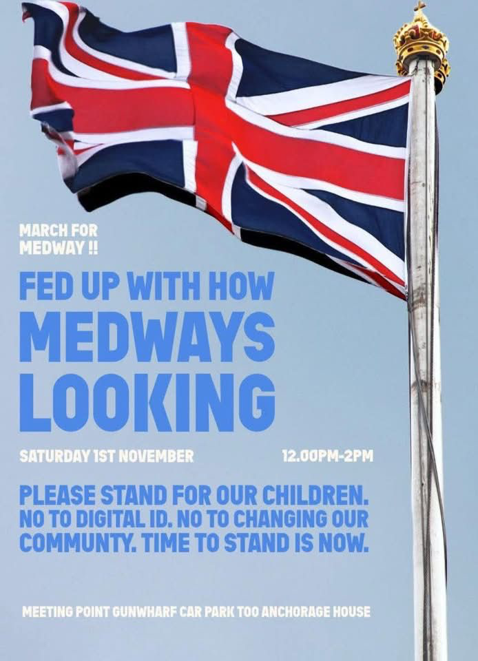 Two weeks later, on Saturday 1 November, Medway faces another protest. This one appears to be organised by the group that has been covering lampposts and roundabouts with flags. They describe their work as ‘community pride.’ Medway Council leader Vince Maple described it last week as intimidation by far-right agitators.