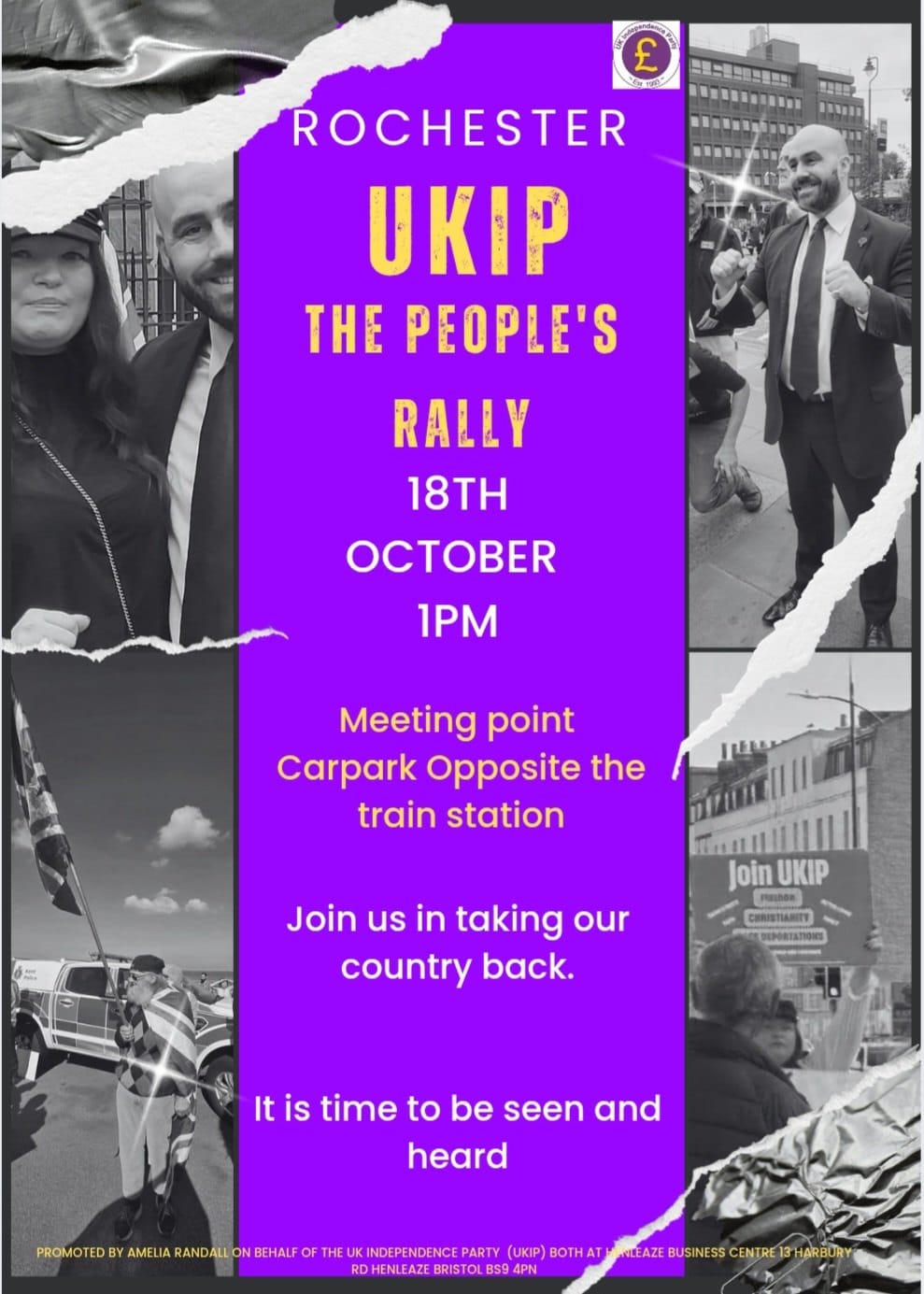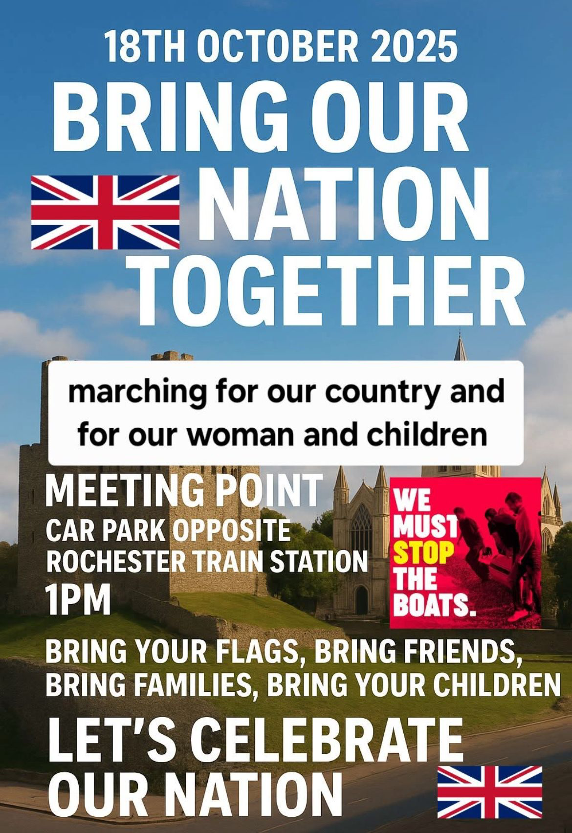 The first is lined up for Saturday 18 October in Rochester. Depending on which version of the poster you have seen, it is either a UKIP protest or a ‘Bring Our Nation Together’ march. Both direct people to gather at ‘the car park opposite Rochester station’ at 1pm, a location so vague it could refer to at least four different places.
