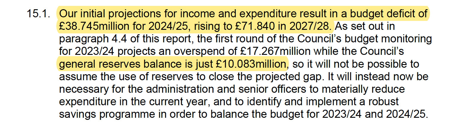 These kinds of figures are completely unsustainable for any local council with limited powers to raise it’s own revenue and next to no reserves left in the bank following the previous administration running them down year on year.