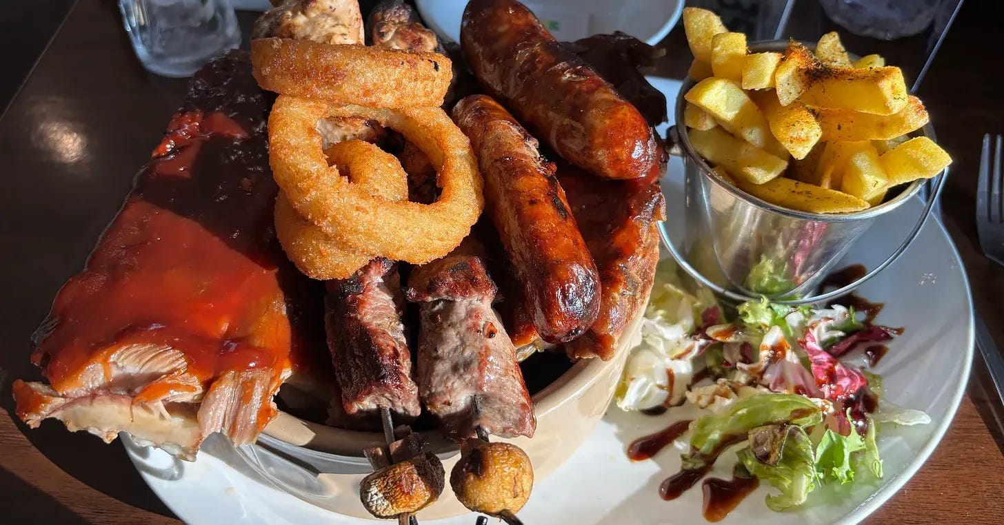 I had come here because I knew they served ‘A Real Dog’s Dinner.’ It is chunks of steak, chicken and mushrooms on skewers, a full rack of BBQ ribs, and two sausages. Served in a genuine dog bowl, just because, all for a princely sum.