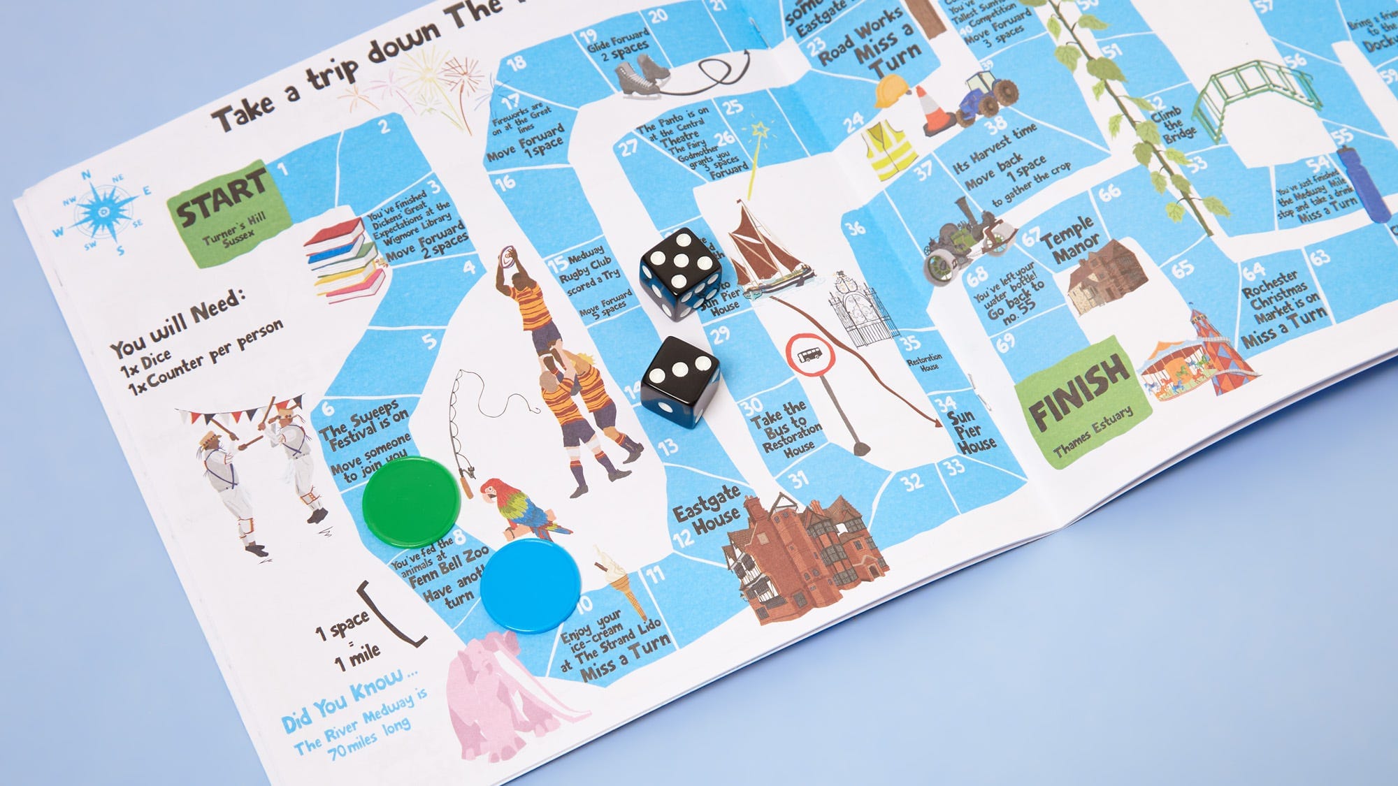 Of course, Thomas Waghorn features in the first activity created, with the opportunity to draw and colour him in. The middle of the book needed an activity that suited a double-page spread, which was ideal for a board game (dice and counters not included): a simple start-to-finish race along the river Medway, controversially starting somewhere in Sussex.