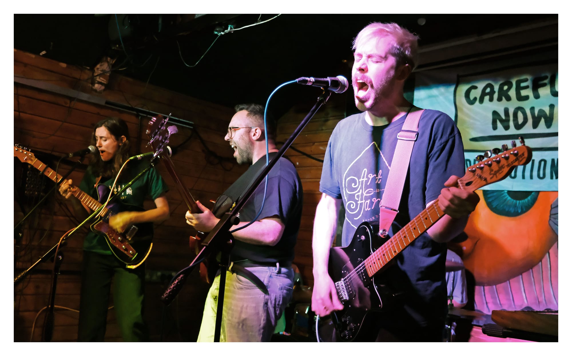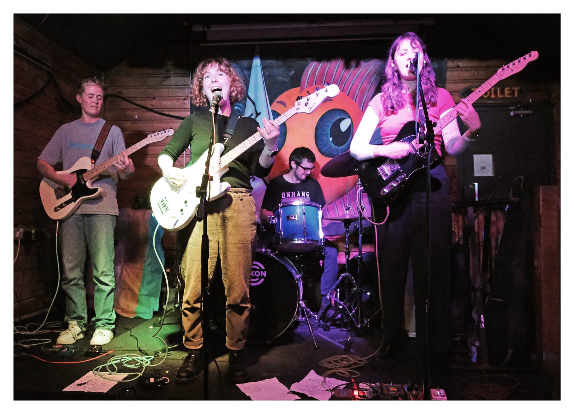 Félicette are something of an indie pop supergroup, and although some members have appeared in other bands for CNP, this is their debut in this ensemble. They are immediately impressive, displaying tight synchronicity despite their self-deprecating commentary between songs. Swapping vocals and blending harmonies between Sophie Mackenzie and Rose Asprey, their sound is reminiscent of the glory days of early 90s American indie alt-rock. Veruca Salt, Belly and Juliana Hatfield are all touchstones, and the band members are delighted to have these comparisons made. There are vitriolic edges to the lyrics, and they make a hell of an energetic noise behind the sweetness of the vocal harmonies. A highlight of the set is a song which might be titled ‘She’s a Pleaser’ but resides on the set list as ‘Cheesy Pizza.’ Félicette are a joy to watch, good humoured, fierce and revelling in enjoying playing together. The audience truly takes them to heart, their feline appeal not lost on a crowd with a recognised tendency towards cat appreciation.