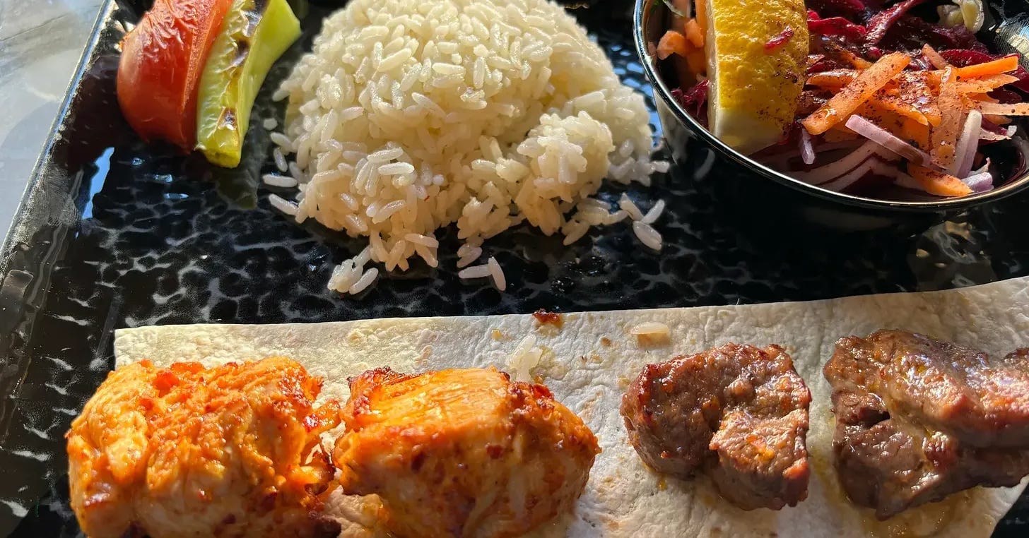 The olives were nice, with a solid texture and good flavour. I was thankful for them as there was a little wait for the starters. The garlic mushrooms were tasty but unexpectedly served in a thick creamy sauce, which was, for want of a better word, stringy. Served with a teaspoon, there was no gentlemanly way to eat them. There was then a longer wait for the mains. The chips were quite bland, and I regretted ordering them because they took away from a great main packed with flavour. The chicken and lamb shish was tender, the rice had a surprising flavour, in a good way, and even the side salad was moreish. Sadly, I didn’t have time for the rice pudding by the time I had finished.