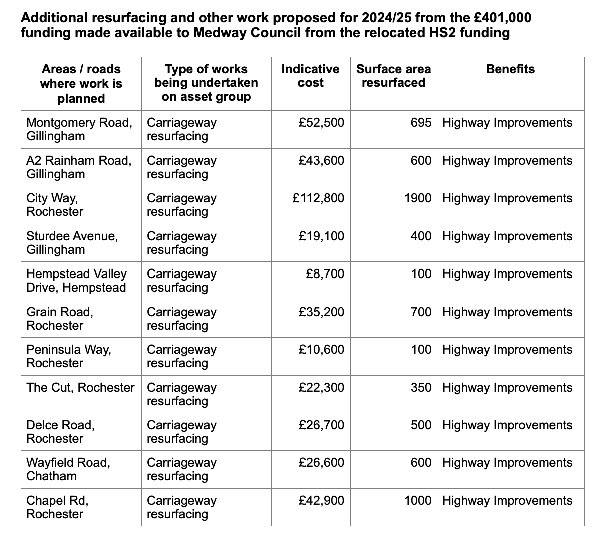 Still, roads do play an important role in places like this, so what exactly will we get? From the document published by Medway Council, the £401,000 will be spent resurfacing a grand total of 11 streets.