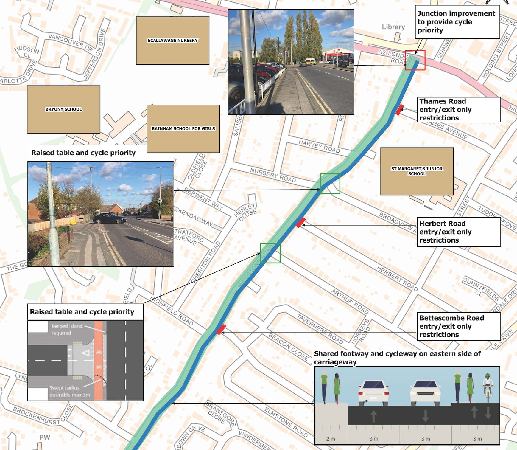 Plans on the cycling side are a little more ambitious, but only on certain routes. One area that does face significant changes is Maidstone Road in Rainham, which will see several connecting roads closed, raised tables introduced, a separate cycle lane, and a 20mph speed limit that will only apply to the main road, and not the considerably smaller streets off of it.