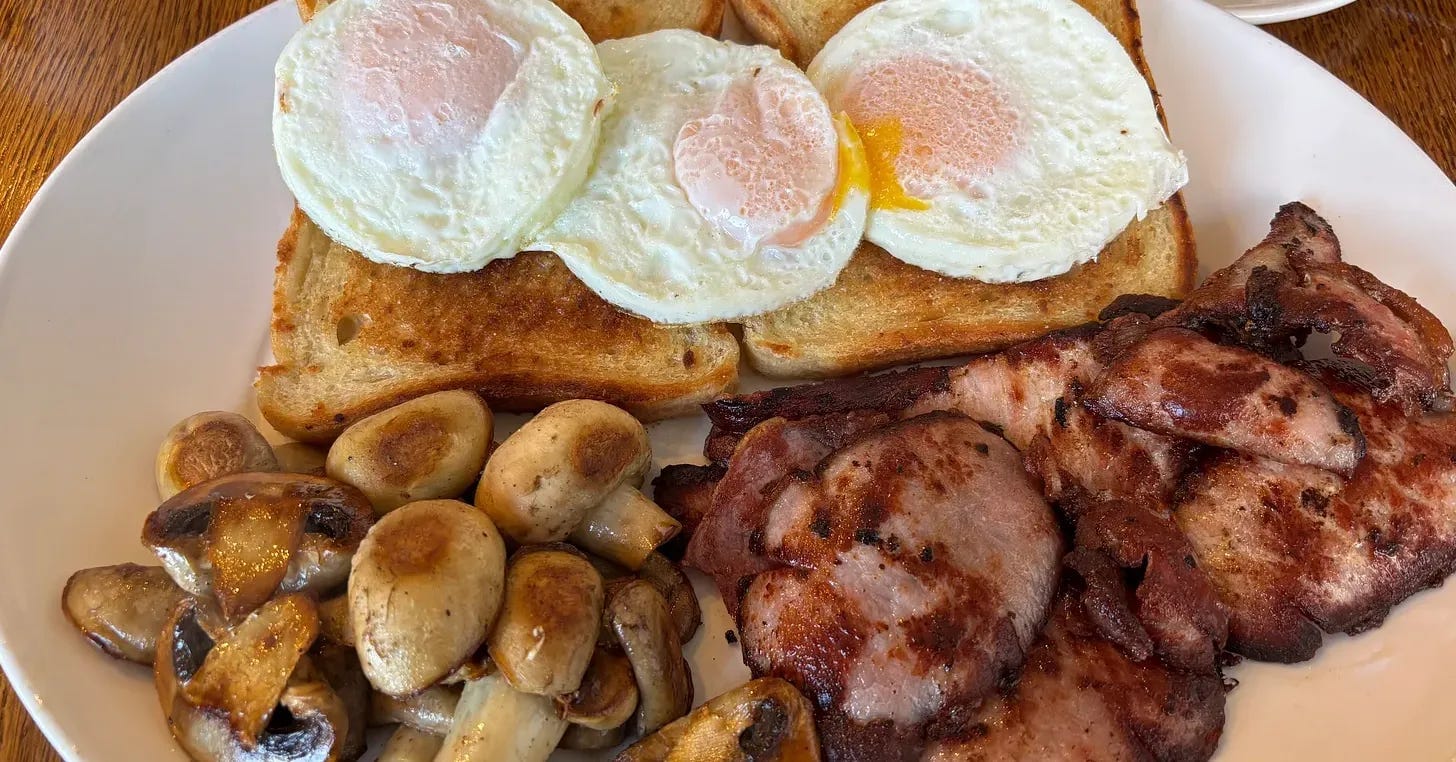 I ordered two fried breads, three fried eggs, four rashers of bacon well done and a portion of mushrooms, with a cup of tea. The server slightly panicked at what to charge for such a meal. Apparently, the extra fired slice pushed it into a higher price point. But when the food when arrived, it looked immense.