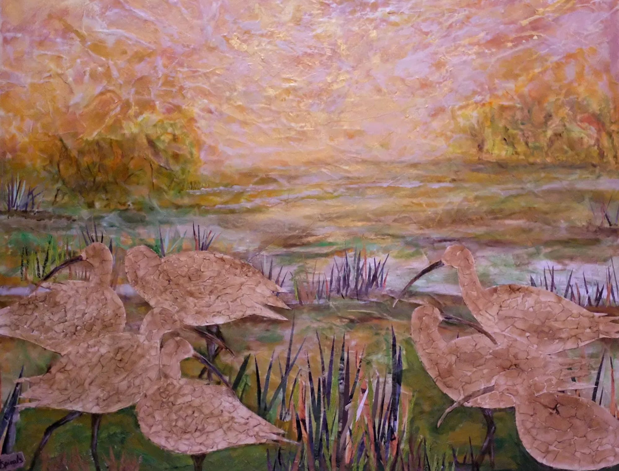 “I work in collage,” explains Fiona, “cutting up climbing magazines, but more now tissue paper and drawing and painting. Mixed media.” Fiona’s part of the exhibition is titled ‘The Plight of the Curlew.’ “In June this year, I'm doing an exhibition in Higham called Marshy Mud Flats and the Call of the Curlew. It's all about North Kent Marshes and the bigger picture of the curlew, who's under threat. A curlew is a large wading bird with a long-curved beak. They live in different parts of the world, but they live and breed in England. “They're endangered because of the way humans are taking their habitats and they have the most amazing call. It's such a soulful, plaintive sound.” All of Fiona’s work is about nature. “That's where my heart is. It's mainly about the marshes because I live a stone's throw from the marsh. I can see the Thames from my studio in the top of the house, a very strong connection with large open spaces with the Thames running through it.”