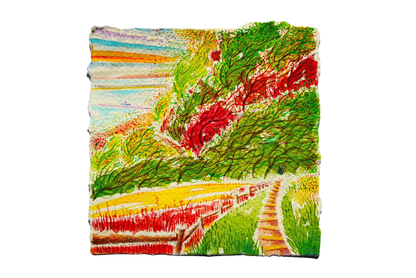 David is known for having a varied style, whether pen and ink sketches, his brutalist architecture drawings, or his much sought-after designs for Careful Now Promotions gigs. For this, he set himself a challenge. He has produced a series of water-coloured paintings, “which have been collected from within my own head,” David tells me, based on his hiking of the Saxon Shore Way. “I was never quite sure why I was producing little thumbnail studies, very abstract studies along the way.” David wanted to challenge himself because the hike itself had been challenging, “both physically and mentally in many ways.” For a decade, David hasn’t used watercolour paints properly for final pieces of artwork. “Watercolours are incredibly unforgiving because once you've stained the paper, there's no turning back.”