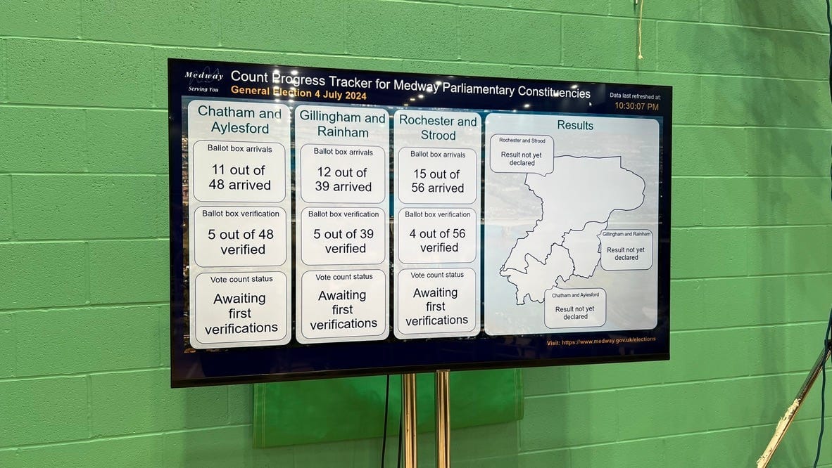 We’ve covered enough elections in our time that we’re used to the drill at Medway Council now, and by and large, they are pretty good at running election counts. There were no big dramas at this count, and all three results were in by a relatively timely 4.30am. Information was delivered clearly to candidates and media in the room (the fancy new data screens were great), staff were suspiciously upbeat given the hour, and a range of drinks and snacks were available. Now, if they could have just got the TV on in time for us to see the national exit poll at 10pm, it would have been perfect…