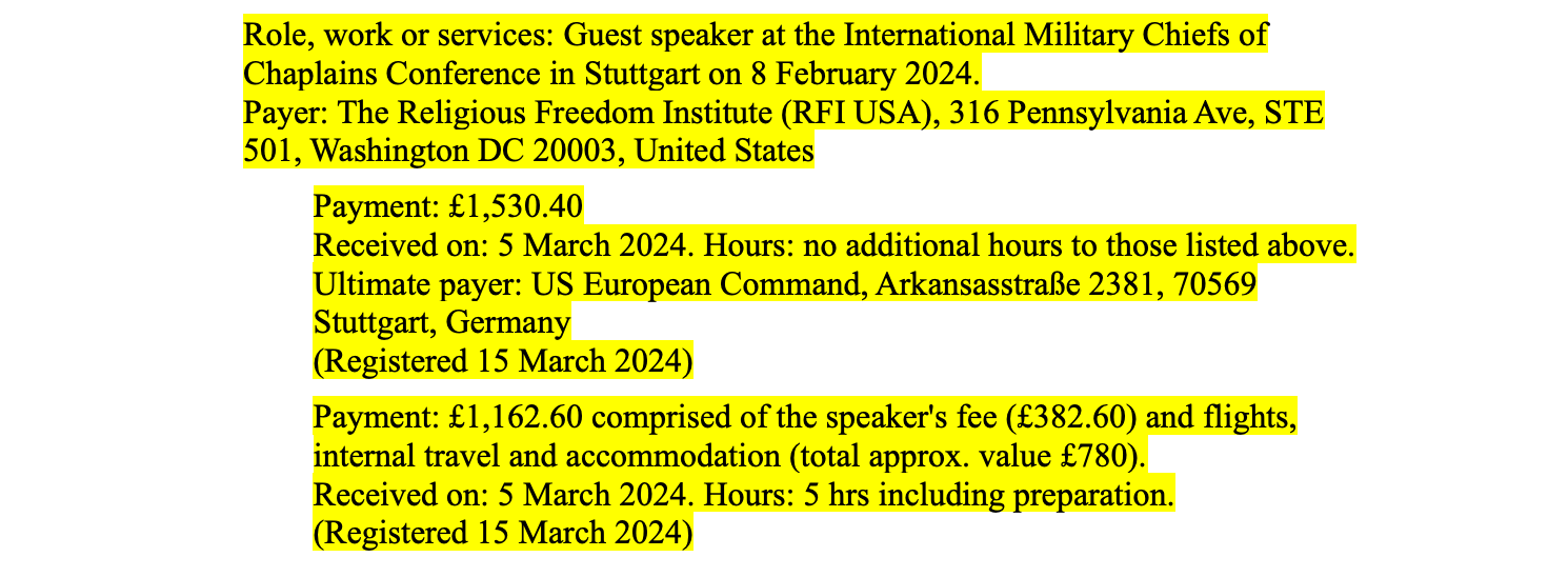 His most recent addition to the Register of Member’s Financial Interests shows a trip to Stuttgart in February to deliver the keynote speech at the International Military Chiefs of Chaplains Conference.