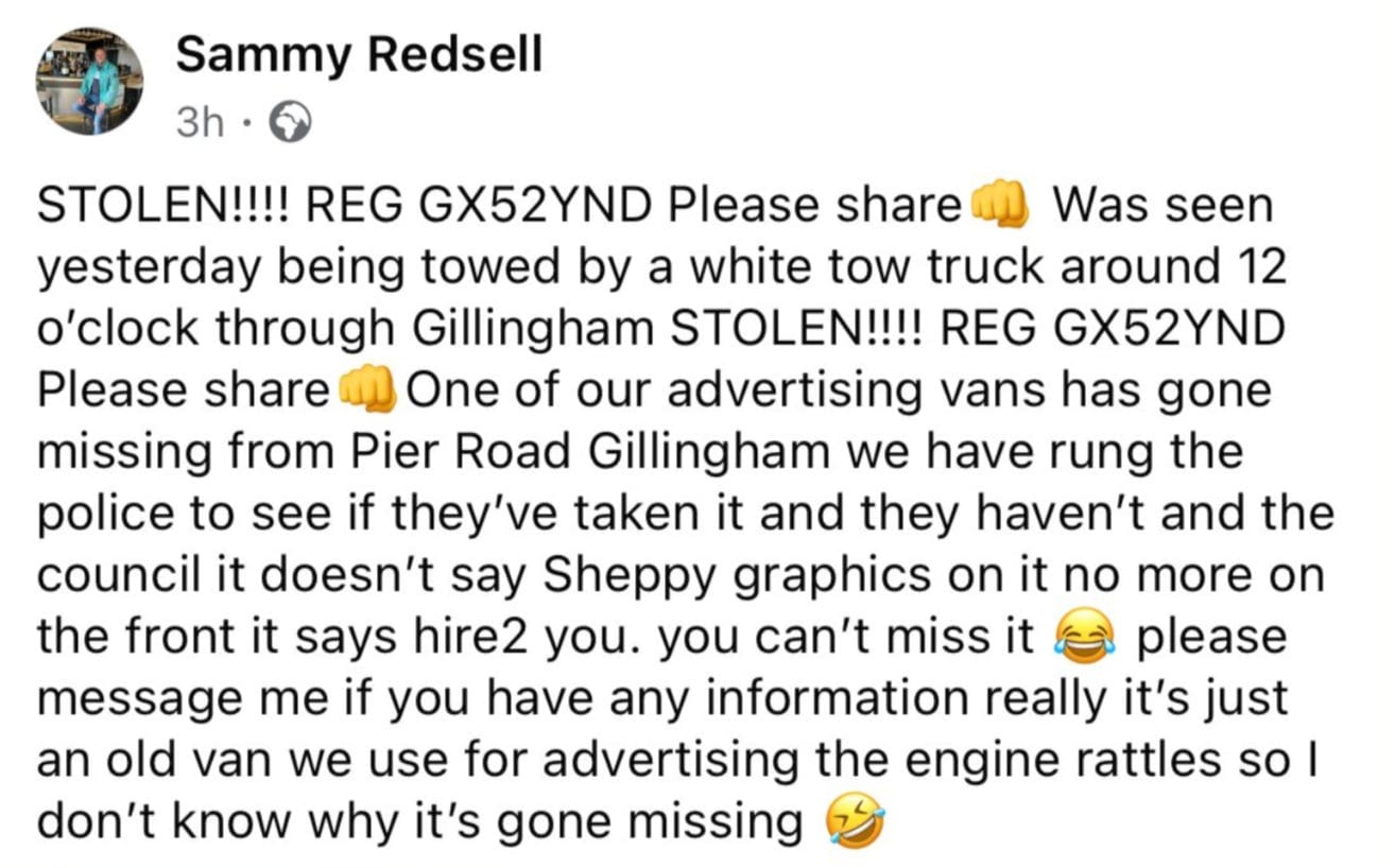 Fast forward to this week, when Sammy Redsell, a former Director of Hire2You, posted across several local Facebook groups asking for help locating his ‘stolen’ van.