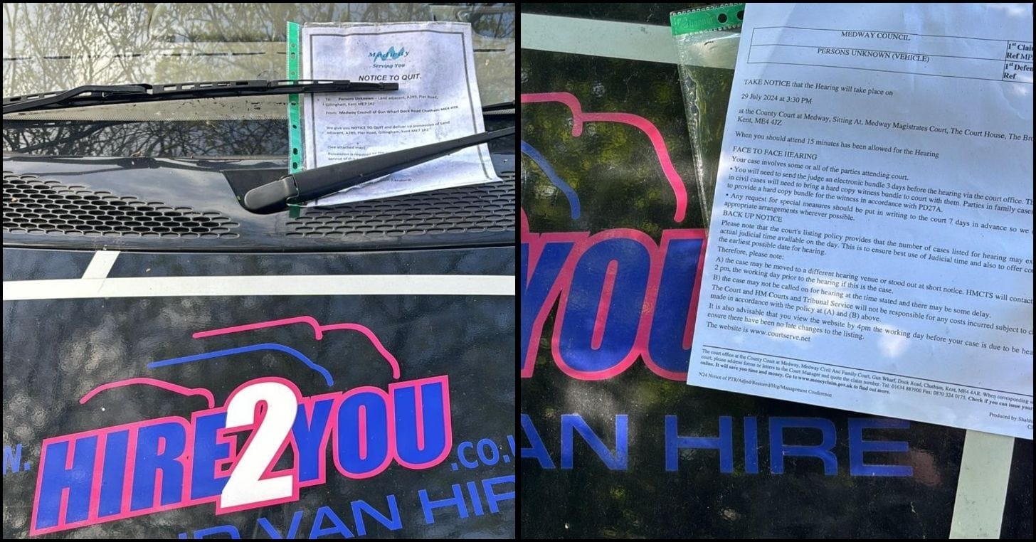 By April, a Notice to Quit had appeared on the windscreen from Medway Council, telling the owner to move their van. By June, this had turned into details of a court date to settle the matter. By September, the windows of the van had been smashed, though this presumably wasn’t a Medway Council action.
