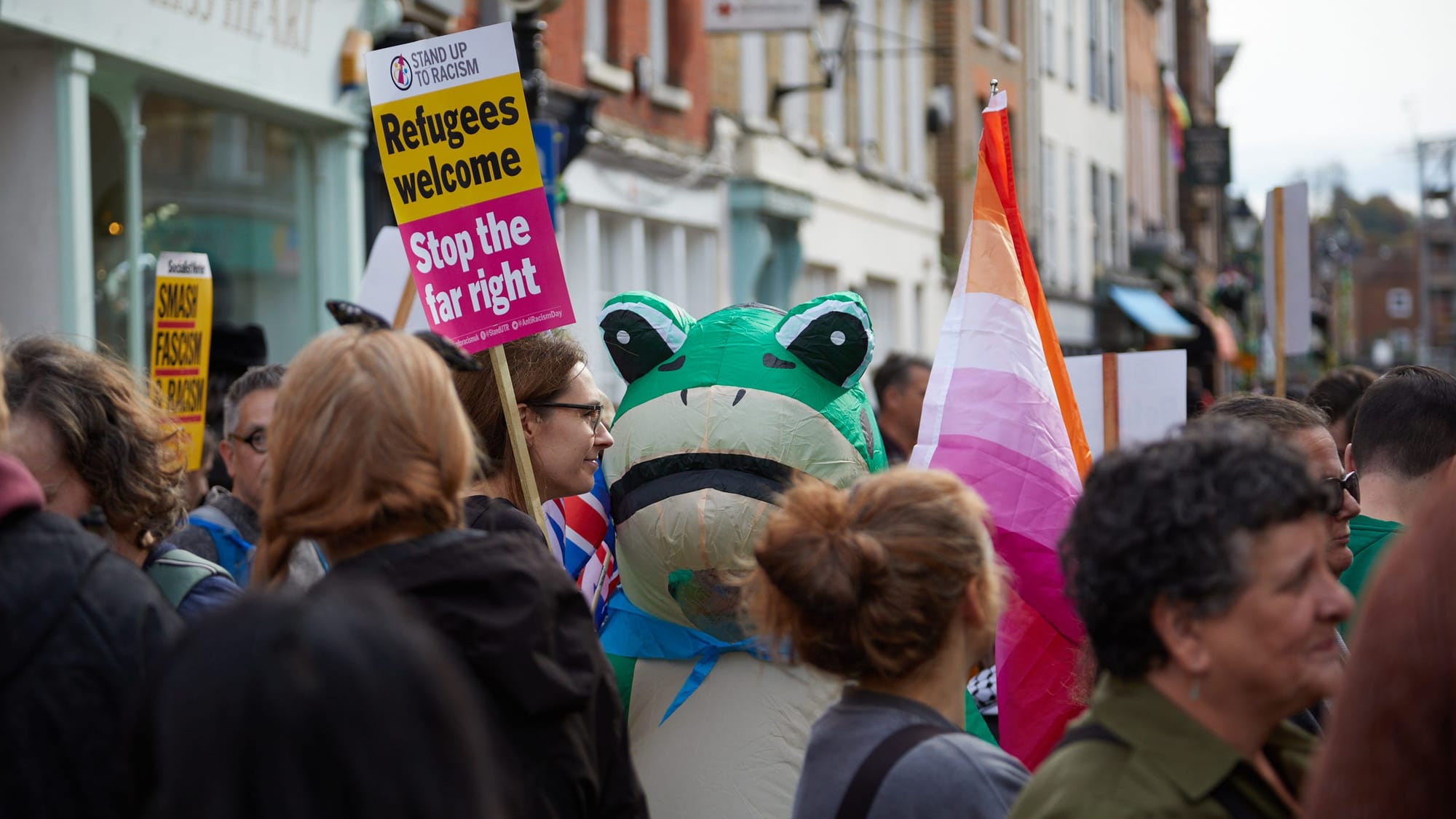 Ahead, the counter-protest was already waiting near Northgate. Around 150 people had filled the High Street under banners reading ‘Refugees Welcome’ and ‘Unity Over Fascism – As We All Argue, The 1% Profit.’ A person in an inflatable frog suit wobbled through the crowd, a live band played banjo and bodhrán, the mood was noisy but calm.