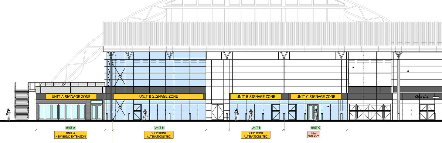 The plans would see a complete remodelling of the area, with three units facing outwards of the centre, allowing them to be open even when the main centre is closed. The intent appears to be to create potential new restaurant or entertainment spaces within the centre, which makes sense given that food seems to work best in the area and retail is experiencing a slow decline.
