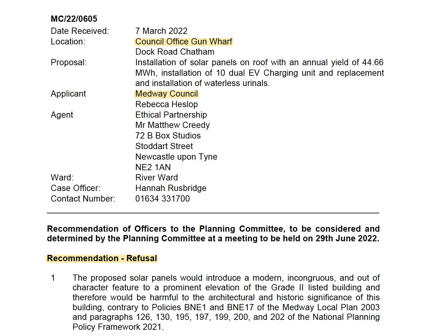 Medway Council duly put in a planning application to themselves to erect the panels on Gun Wharf in Chatham.