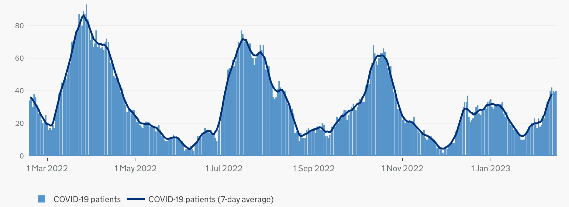 Cases: No one is bothering to collect any data now beyond a once-per-month publication from the Office for National Statistics, so who knows?