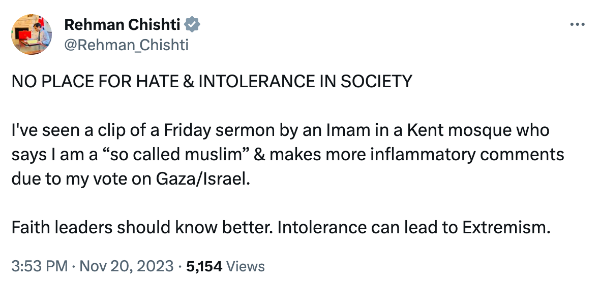 The sermon comes from an Iman at Chatham Hill Mosque & Kent Islamic Centre, and following an impassioned plea to help the people of Gaza, including by lobbying MPs, he references Rehman, albeit not by name. He does call him a “so-called Muslim”, which sure, isn’t really cool, but beyond that, there’s little beyond referring to his vote as “disgusting” and calling out his “audacity”. Tough words indeed, but we’ll leave it up to readers to decide whether they meet the threshold for intolerance or extremism.