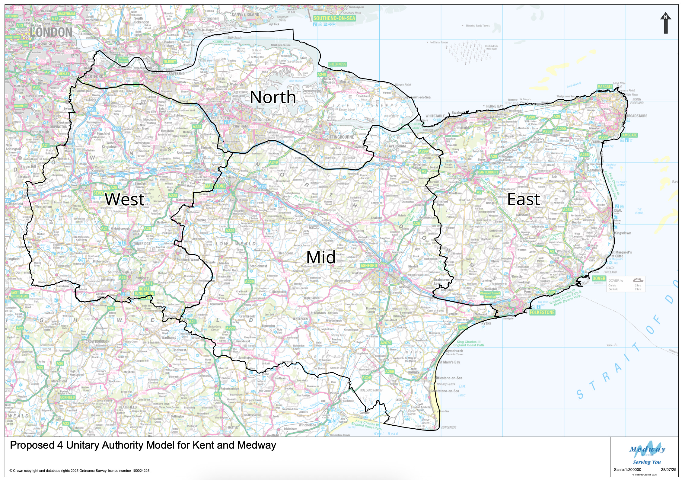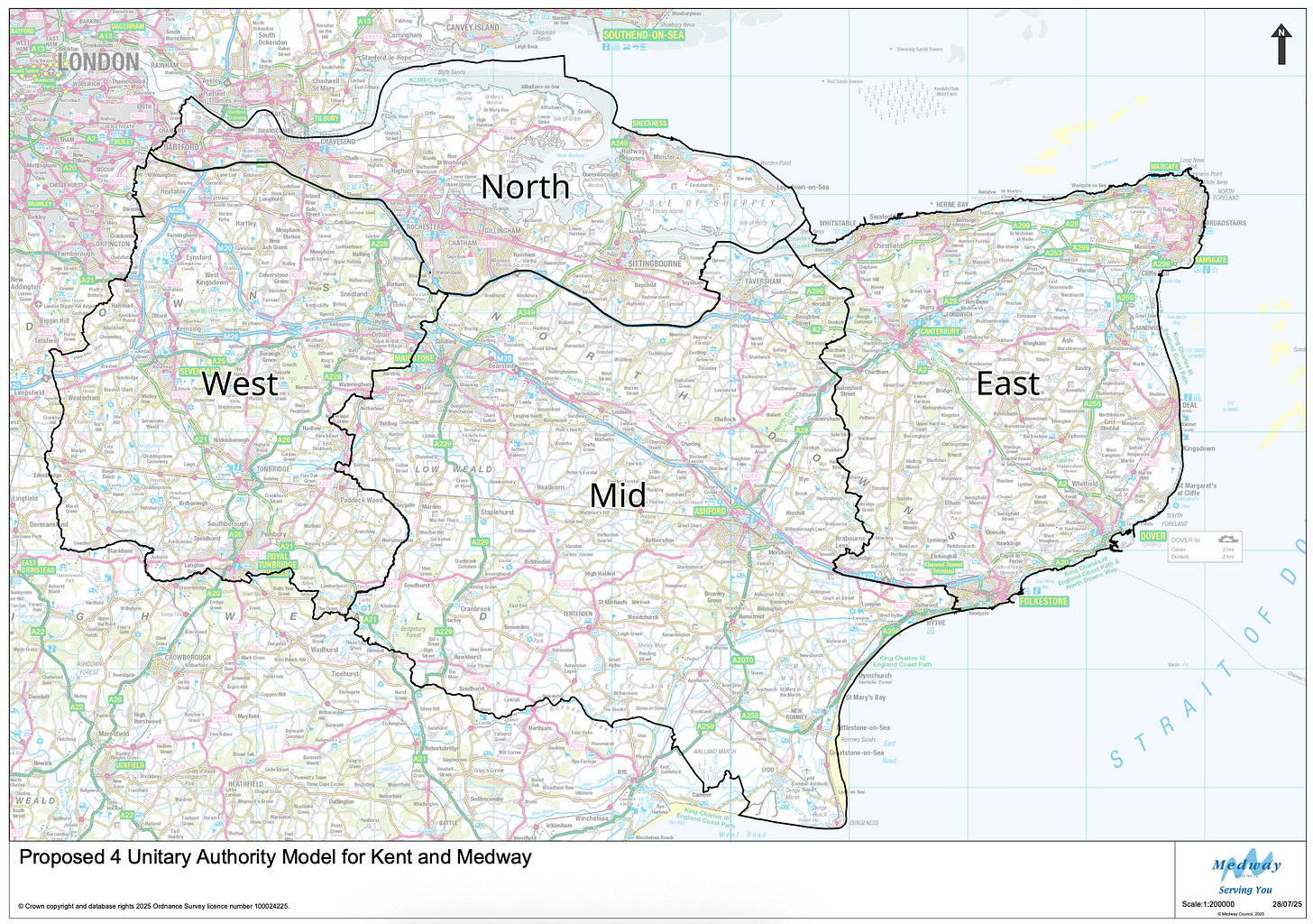 Medway Council has thrown a grenade into Kent’s local government reorganisation by publishing its own map for how the county should be carved up, seemingly without consulting anyone else in advance. The plan would split Kent into four new unitary authorities, with Medway folded into a ‘North Kent’ council running from Dartford to parts of Swale.