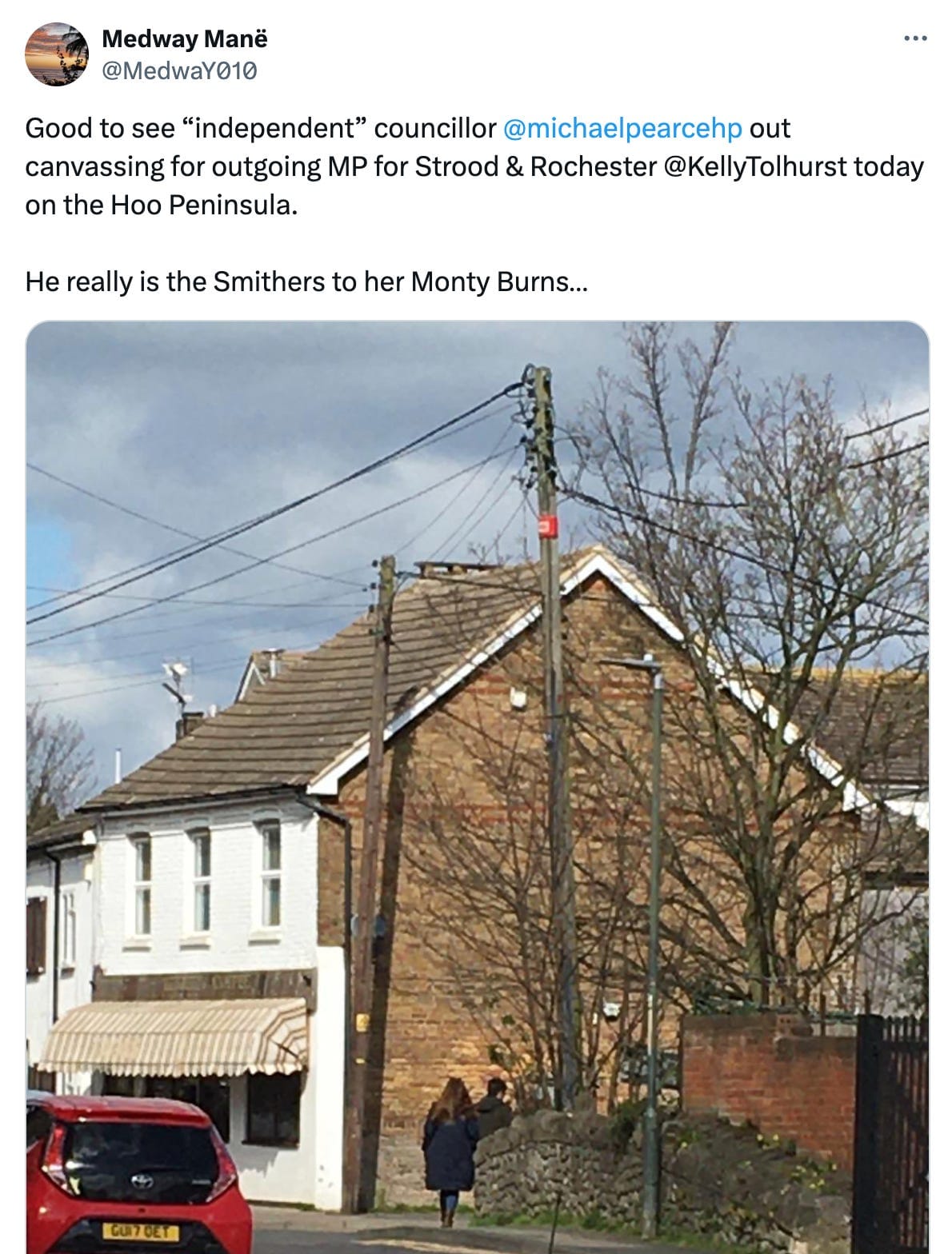 It all started on Sunday afternoon, when the anonymous Medway Manë, who often posts snarkily about local politics, uploaded a photo of Rochester and Strood MP Kelly Tolhurst and deputy leader of the Independent Group on Medway Council Michael Pearce out and about together in Hoo.