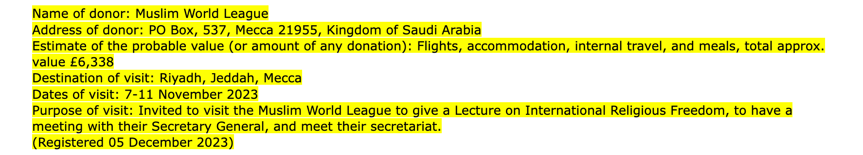 The latest update to the register of interests for the Gillingham and Rainham MP reveals a trip last month to Saudi Arabia funded by the Muslim World League to give a lecture and some meetings. The entire jaunt was over five days and resulted in a travel, accommodation, and hospitality value of over £6,000.