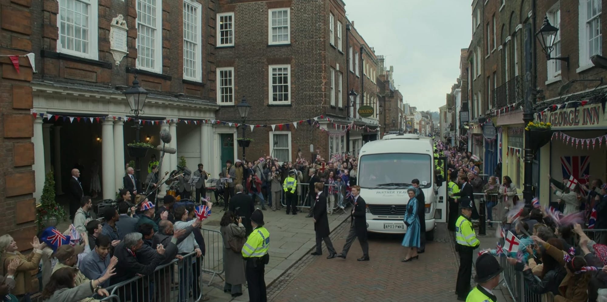 The scene is a very brief affair, with little of the High Street being scene, which does make one wonder why they went to the detail of changing all of the shop signs (except Baggins, for some reason) when you can’t see most of them on screen anyway. Amusingly, they even went to the effort of digitally removing Pizza Express’ sign, but it’s rather more understandable why a series with a royal connection might want to avoid that particular brand.