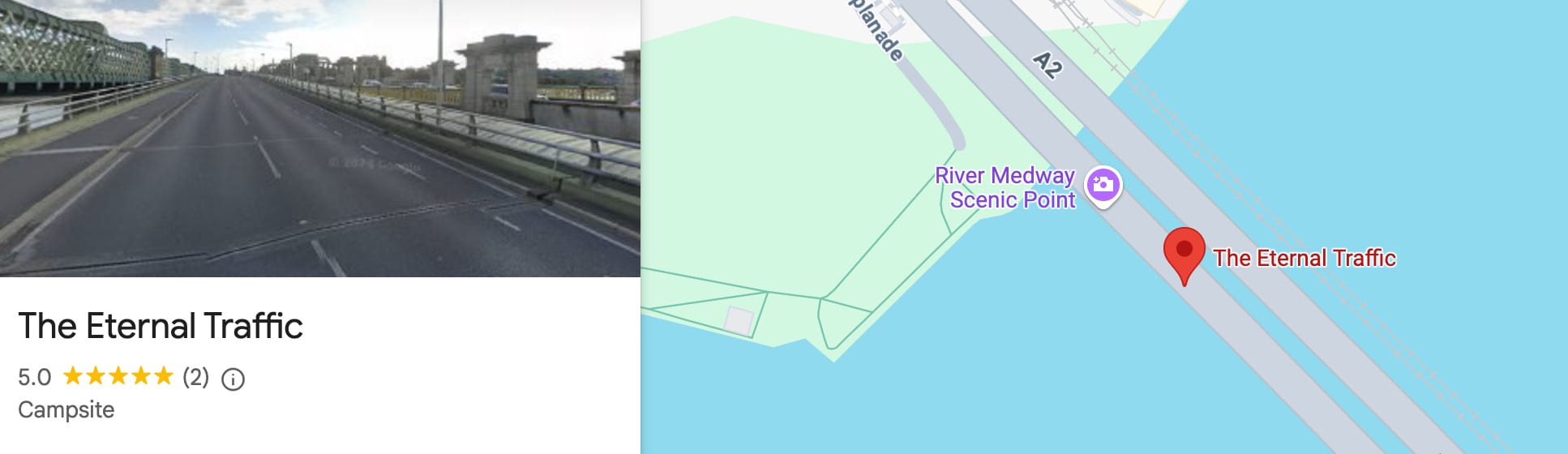 ⛺ Shout out to the person who got Rochester Bridge listed as ‘The Eternal Traffic’ campsite on Google Maps. The site holds a five-star rating, with one reviewer writing, “Really lovely views while sitting absolutely still for 3 hours just to cover 20m of bridge. phenomenal. would bridge again!”