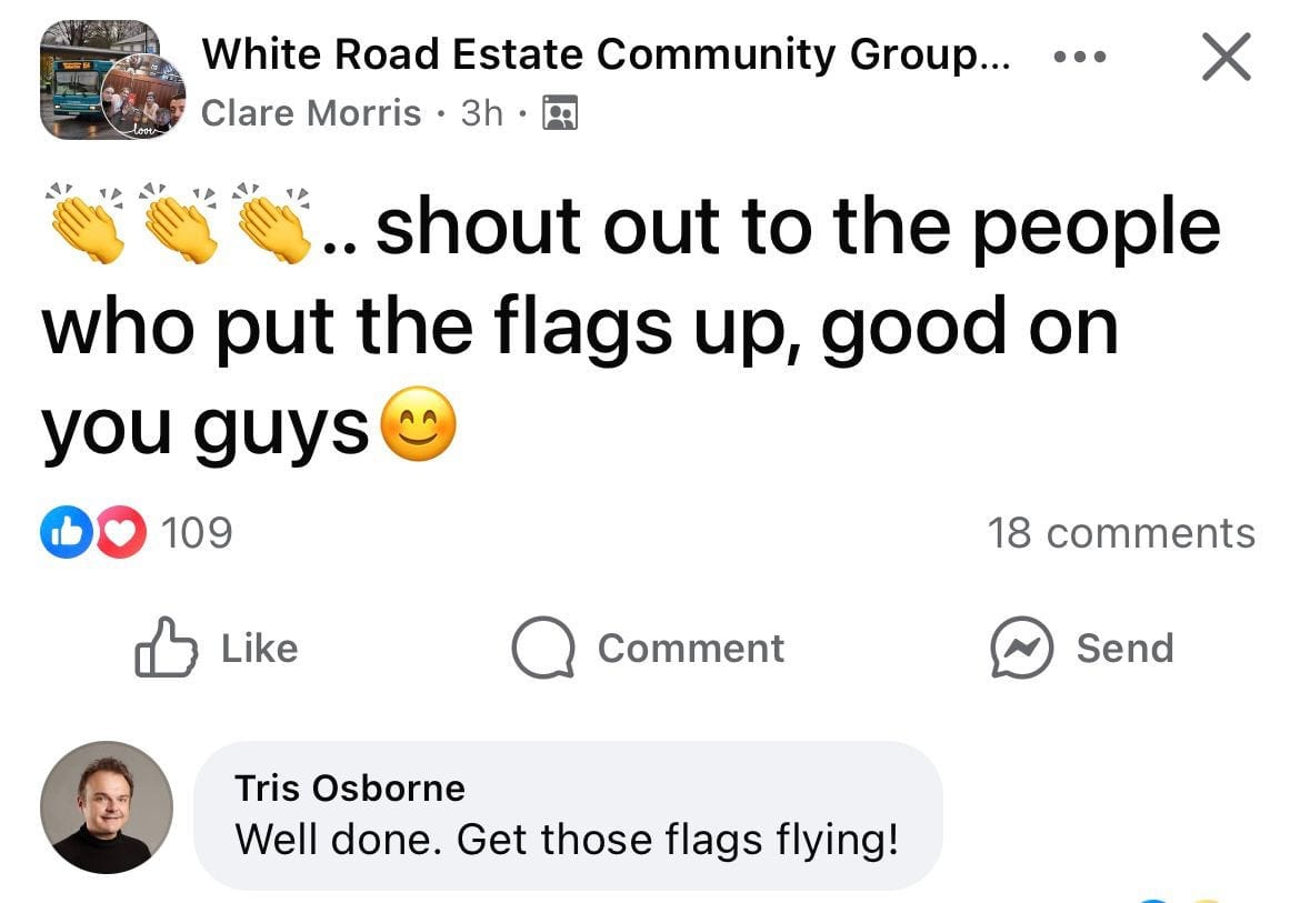 We asked Osborne to confirm he was supporting residents attaching flags to public infrastructure on the White Road estate, given it seemed at odds with the council’s position that doing so is unlawful. He told us:
