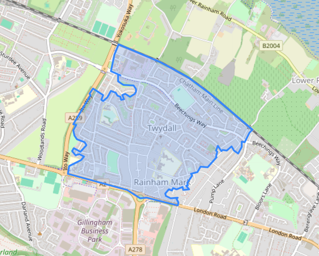 Twydall is similarly more limited than the shorthand being used around it. It is essentially Twydall, not 'Gillingham and Twydall' in any broader sense, and it is nowhere near Gillingham town centre. Once again, there are streets which most local people would obviously think of as Twydall that appear to fall outside the line.